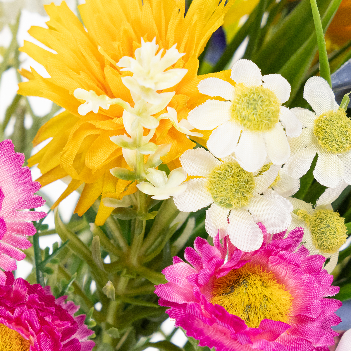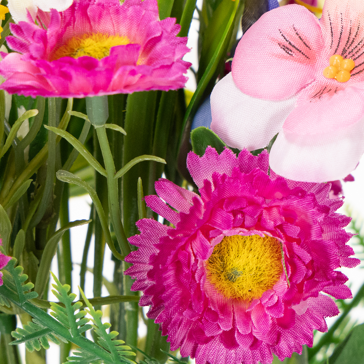 Ez az élénk színű művirágcsokor, részletgazdag, élénk sárga, rózsaszín és kék árnyalatú virágaival, a tavasz hangulatát varázsolja otthonába. Kiváló minőségű poliészterből és műanyagból készült, hihetetlenül realisztikusnak tűnik, és kivételes színtartósságával és alaktartósságával lenyűgöző. A színes tavaszi virágok és a természetes zöld árnyalatok kombinációja különösen sokoldalúvá teszi: kiegészíti a vidéki stílusú enteriőröket, fokozza a skandináv dekorációt, és ugyanolyan jól harmonizál a modern dizájnokkal.