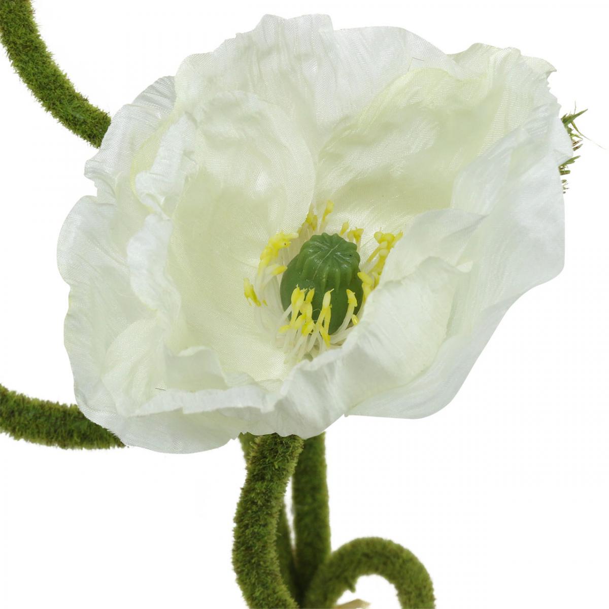 Minden mák egy nagy, nyitott virágfejben végződik, amelyen a tipikus virágkapszula egy része még mindig rögzítve van. A mákvirágok mindegyike egy igazi virág jellegzetes összetevőivel rendelkezik: hullámos, finom fehér szirmok zárják körül a zöld és sárga színű, gondosan kidolgozott maghüvelyeket.