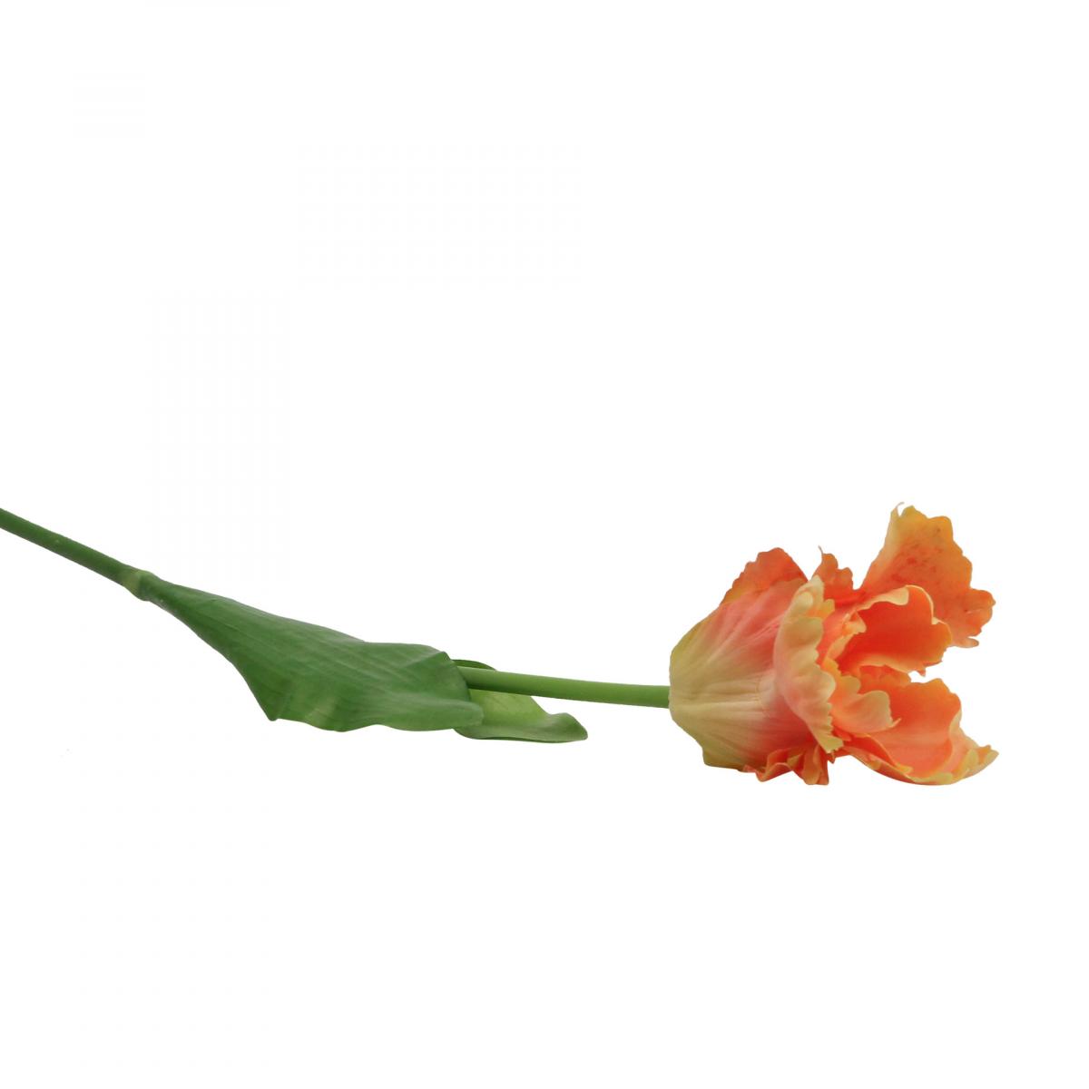 A tavaszi virág, mint művirág sárga-narancs színben igazinak és szinte egzotikusnak tűnik rojtos, nagy szirmaival. A műnövény virágfeje szövetből, a szár és a levelek habszivacsból készült, így a tulipán a népszerű Real Touch minőséget adja.