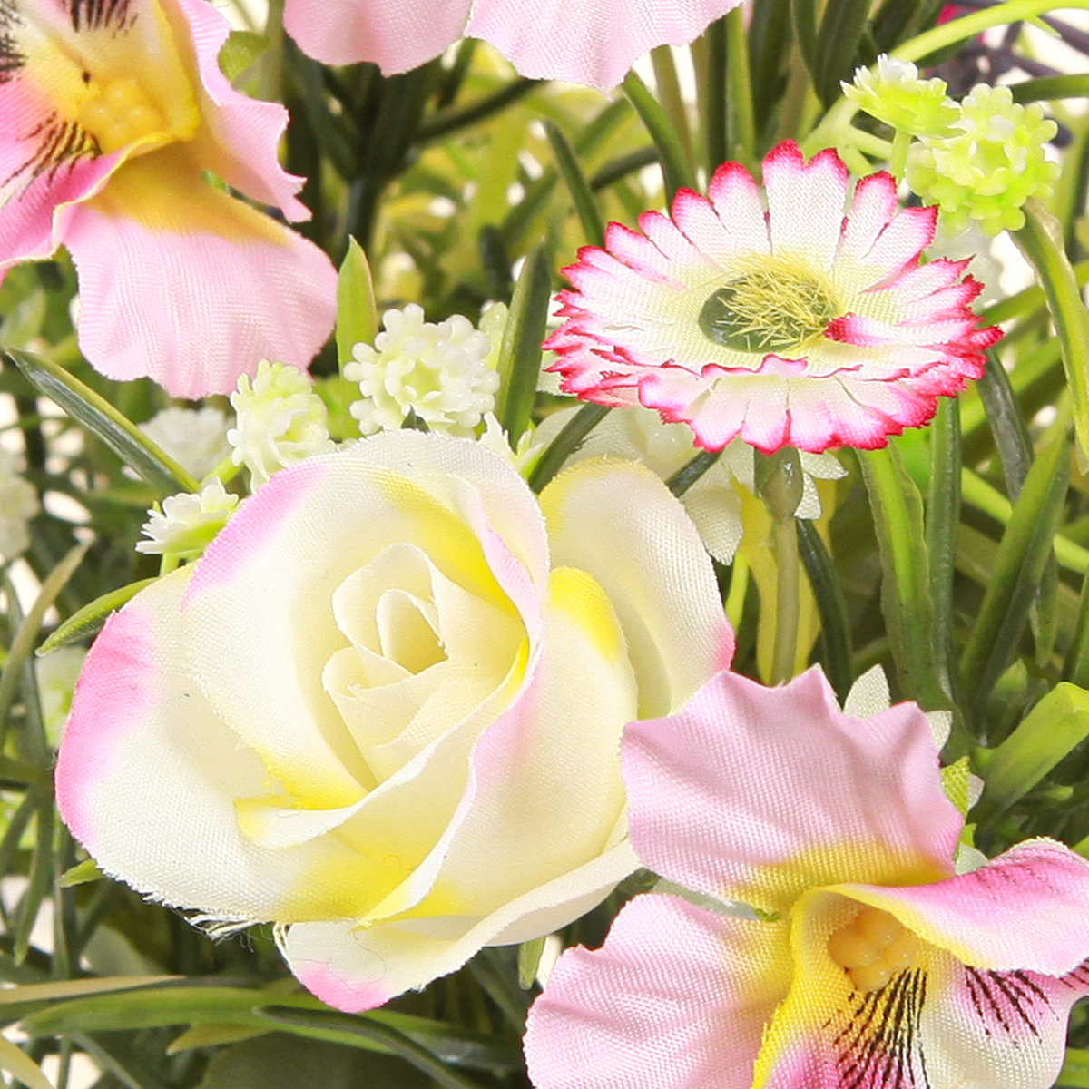 Varázsoljon romantikus hangulatot otthonába művészi kis művirág csokorunkkal. Ez a körülbelül 18 cm átmérőjű és körülbelül 25 cm magas varázslatos csokor mindenki figyelmét magára vonzza. Tavasszal és nyáron tökéletes asztaldísznek ez a mesterséges csokor, amely hosszan tartó alternatívát kínál a valódi virágokkal szemben, és évszaktól függetlenül teljes virágzásban marad. A krémszínű százszorszépek, sárga rózsák és lila levendula művészi keveréke frissességet és élénkséget kölcsönöz minden helyiségnek. A csokor mindenféle vázába tökéletesen illeszkedik, és könnyen beilleszthető különböző belső stílusokba, legyen az bohó, vintage vagy klasszikusan elegáns. A stílusos dizájn és a praktikus kezelés szimbiózisával ez a művirágcsokor dekoratőrök és virágüzletek kötelező darabjává válik.