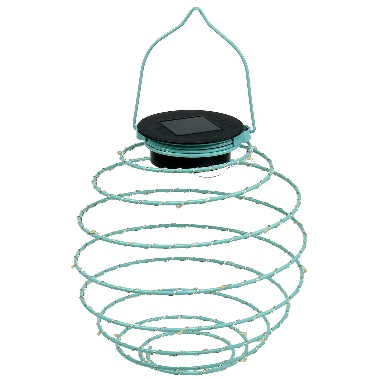 A türkiz színű, 25 LED-es melegfehér napelemes kerti lámpa körülbelül 2,5 centiméter magasra van felhajtva, és felakasztva a lámpa körülbelül 22 centiméter magas. Egyenként körülbelül 16 centiméter átmérőjű.