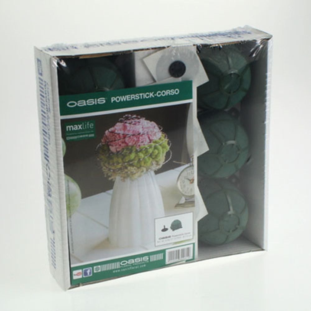 A Powerstick Corso nedves, feltűzhető habbal az OASIS®-tól egy összesen 6 darabot tartalmazó kellékcsomagban található. Mindegyik tartó körülbelül három hüvelyk átmérőjű és magasságú.
