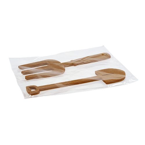 Az erős, világosbarna filcből készült kerti szerszámot összesen 4 darabos zacskóban szállítjuk, egyenként két ásóval és két vasvillával. A hozzávetőleg 0,5 milliméteres anyagvastagság mellett az ásók körülbelül 29,5 centiméter hosszúak és legfeljebb 7 centiméter szélesek a lapátlapáton, míg a vasvillák körülbelül 29,5 x 8,5 centiméteresek.
