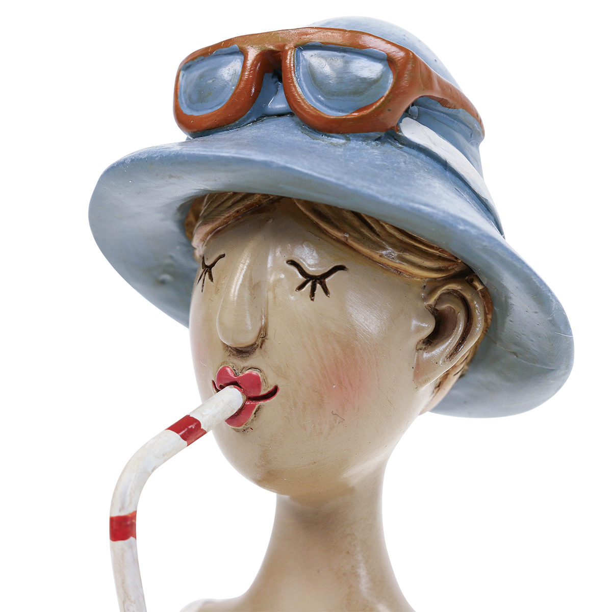 A kék-fehér tengerész megjelenés eredeti módon húzza alá a nyári témát. A barna napszemüveg egy fehér szalaggal ellátott kék kalapon is ül. Az arckifejezéséből jól látszik, hogy a nő élvezettel iszik a szalmából. Csukott szem, szívószálra nyitott száj – ilyen a nyár íze!