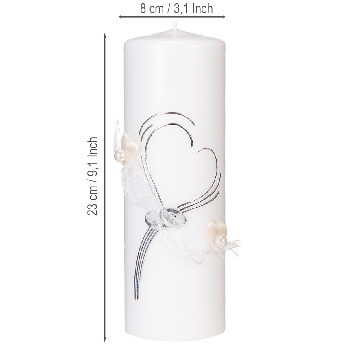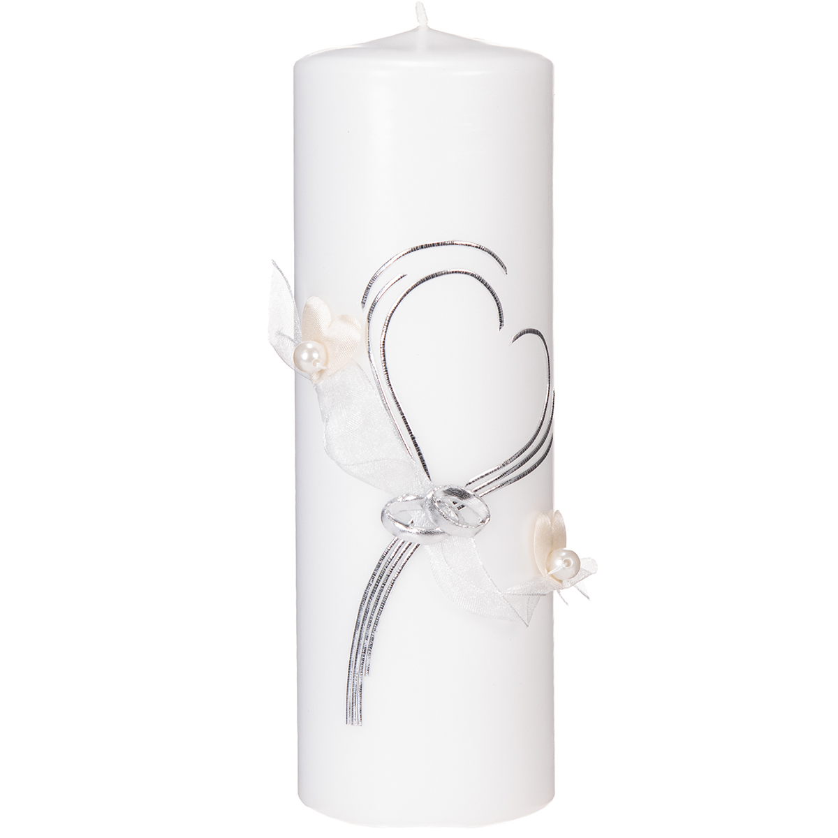 Ünnepi esküvői gyertya stílusos szív alakú mintával, ezüst díszítésekkel és organza szalaggal – ideális esküvőkre és ezüst házassági évfordulókra, 230/80 mm