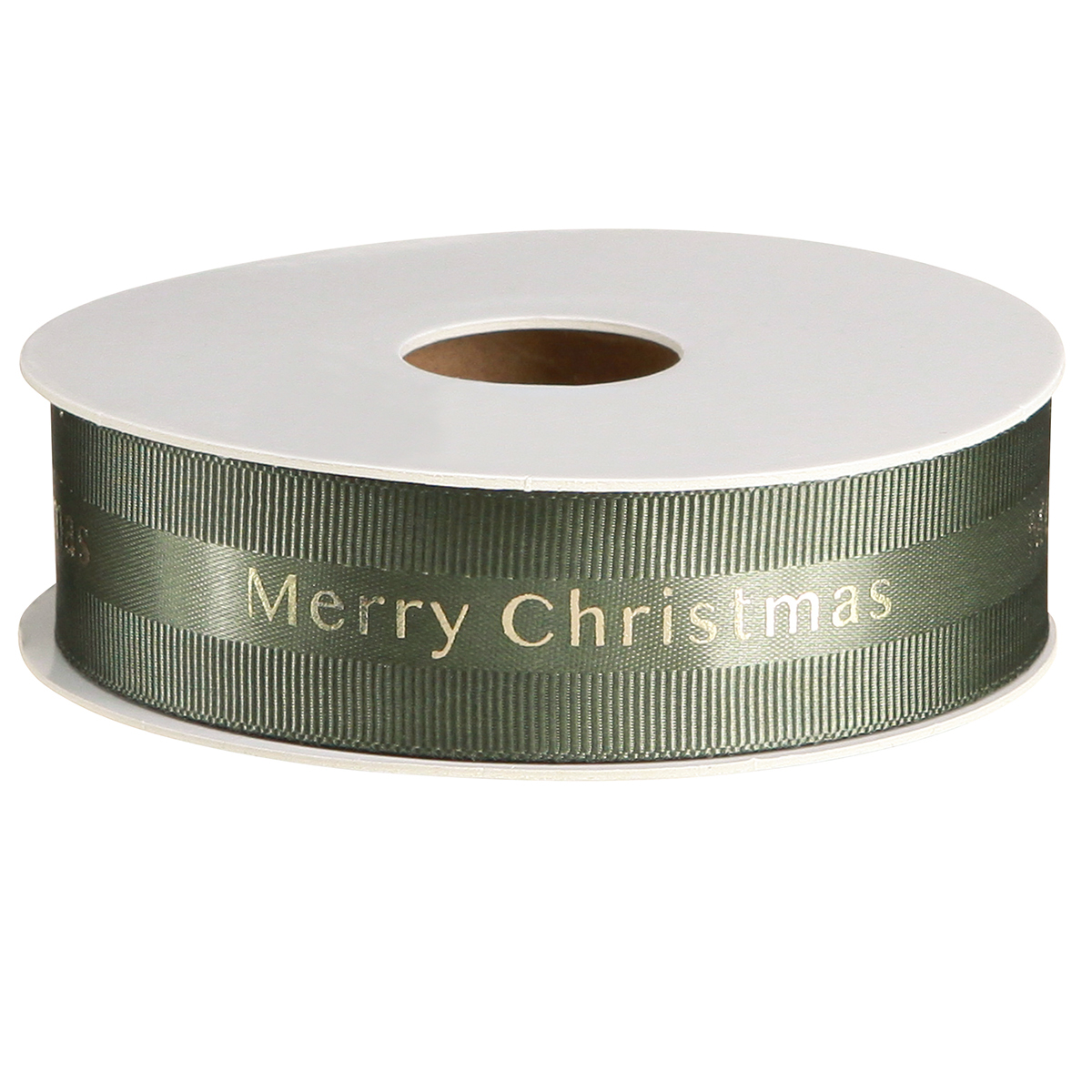 Ünnepi karácsonyi szalag sötétzöld színben arany 'Merry Christmas' felirattal, szélessége 25mm, hossza 20m