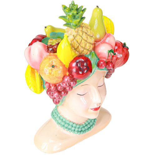 A művészi növényfejet egy nő mellszobraként tervezték trópusi gyümölcsökkel, és több, mint dekoráció. Ez a gazdagon festett mellszobor ötvözi az eleganciát és a trópusi extravaganciát. Egyedi dizájnja, amelyben a stilizált női szobrot egzotikus gyümölcsökből, például csillaggyümölcsből és ananászból készült kalap díszíti, azonnal felkelti mindenki figyelmét. Ez a gyönyörű dekoráció kiváló minőségű polirezinből készült, és igényesen kézzel festett, így minden darab egyedi karaktert és művészi hangulatot ad. Bár a váza nem teljesen vízálló, szárított virágvázának vagy kreatív tolltartónak ideális. Jelenlétük egy csipetnyi trópusi hangulatot kölcsönöz a nappalinak, mint stílusos asztalközép vagy fürdőszobai kiegészítő. Fedezze fel ennek a szemet gyönyörködtető otthoni kiegészítőnek a sokoldalú felhasználási lehetőségeit, és gazdagítsa környezetét ezzel az egzotikus díszítőelemmel.