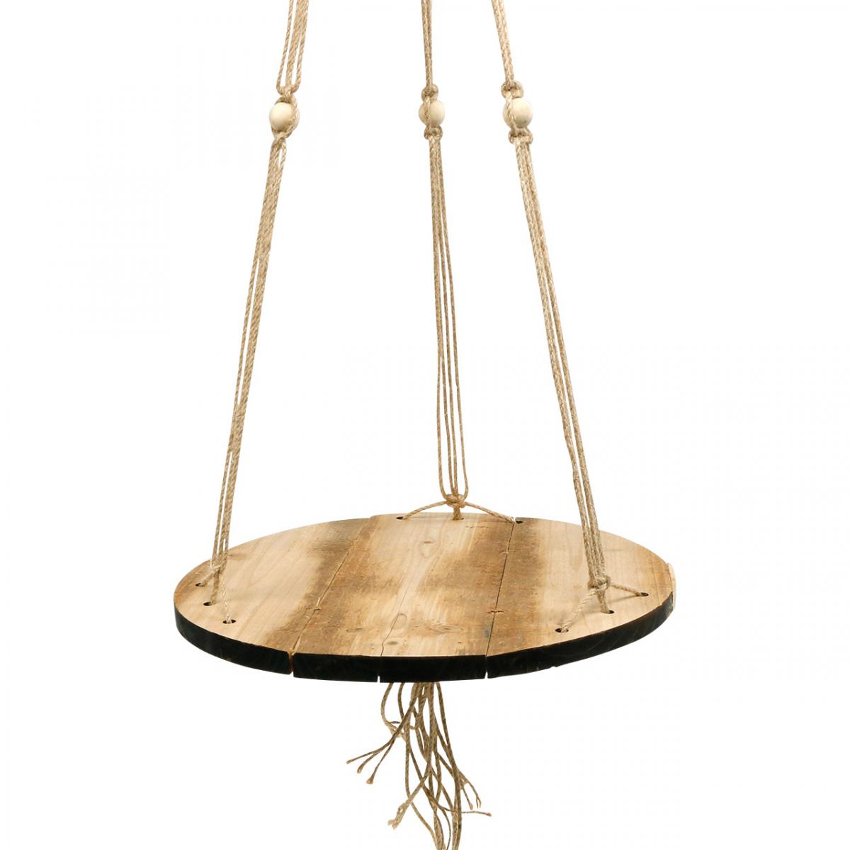 A függőkosár egy nagy, kerek fa tálcából áll, amely három, rusztikus színű deszkából áll. Három helyen vannak rögzítési lyukak: A növényhinta felfüggesztése összesen tizenkét juta kötélből és három fagyöngyből áll, amelyek a lyukakon keresztül vannak átfűzve, és két szinten dekoratívan, makramé stílusban összekapcsolódnak. A juta zsinór felfüggesztése egy nagy hurokban végződik, mellyel a gyönyörű makraméval ellátott akasztókosarat rögzíthetjük a mennyezetre.