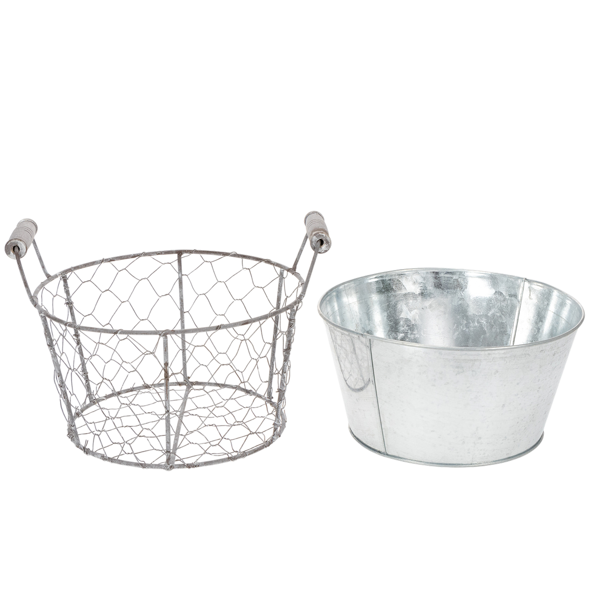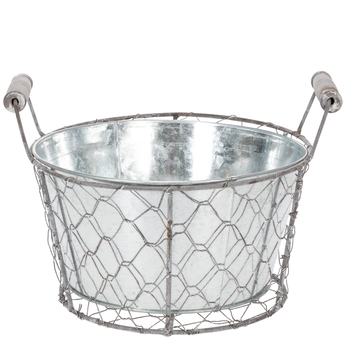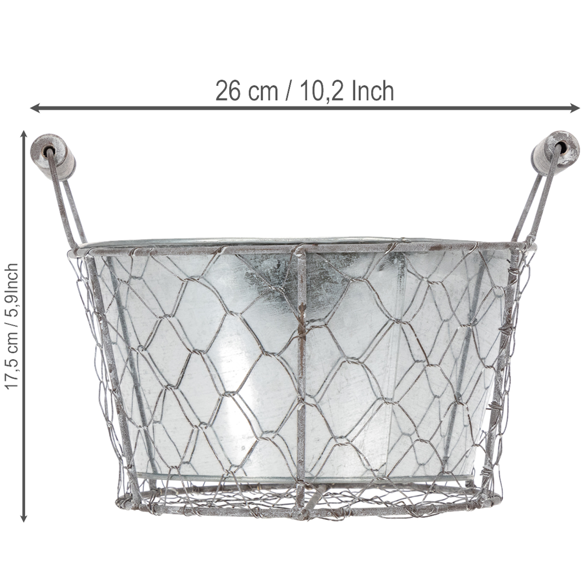 Növénykosár betéttel, drótkosár, virágtartó, tavaszi ezüst, fehérre meszelt, shabby chic, Ø22cm H17.5cm