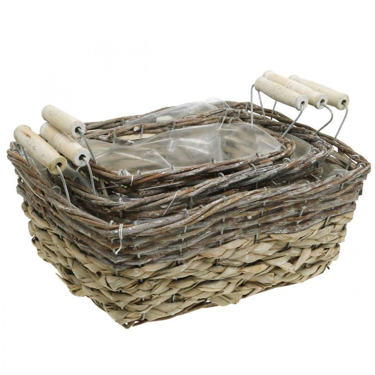 Növénykosár fogantyúval, négyzet alakú kosártál, natúr ültetőgép kopott elegáns mosott fehér L30/25,5/21 cm H12/11/10 cm 3 db-os készlet