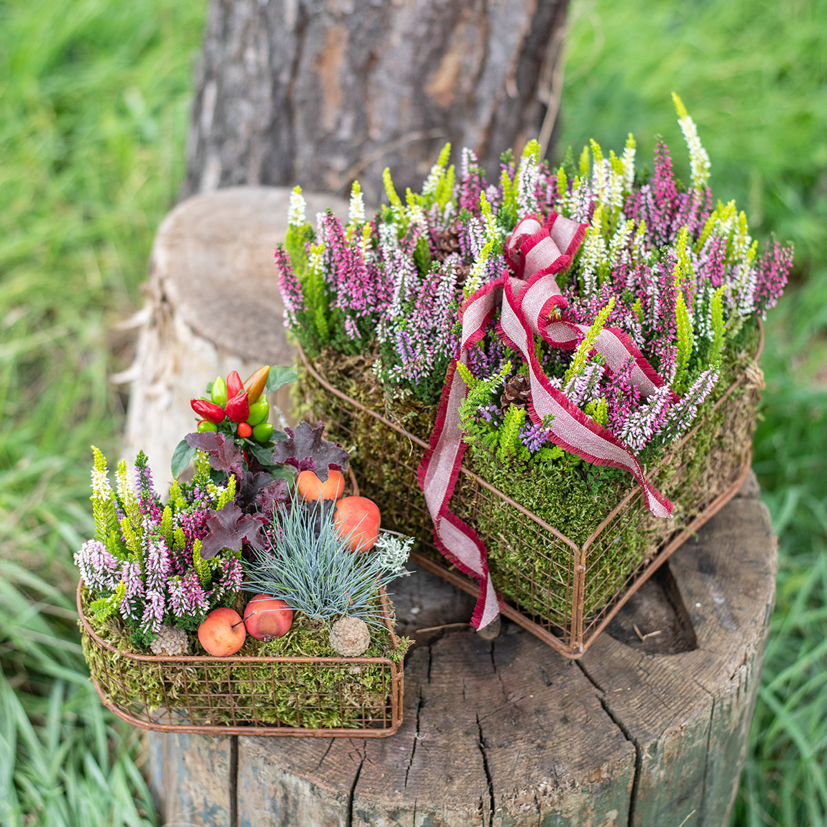 Helyezze a növényi tálat a kert padlójára, és használja a virágok, füvek és gyógynövények kis hangulatát. A hálókosarat az erkélykertben is használhatod szív alakú elrendezés kialakításához.