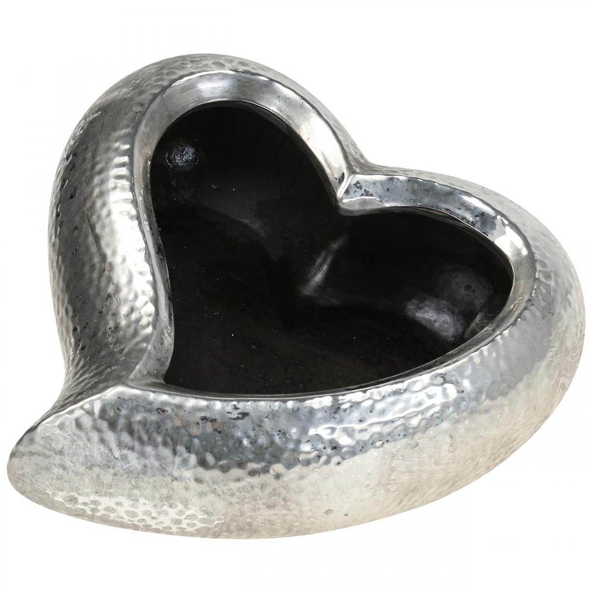 Az ültetőgép körülbelül 24 centiméter széles és 10 centiméter magas. Kívülről a gyönyörű szív deco virágtál fényes ezüst mázas, felülete pedig úgy néz ki, mint egy kalapált fémdísz.