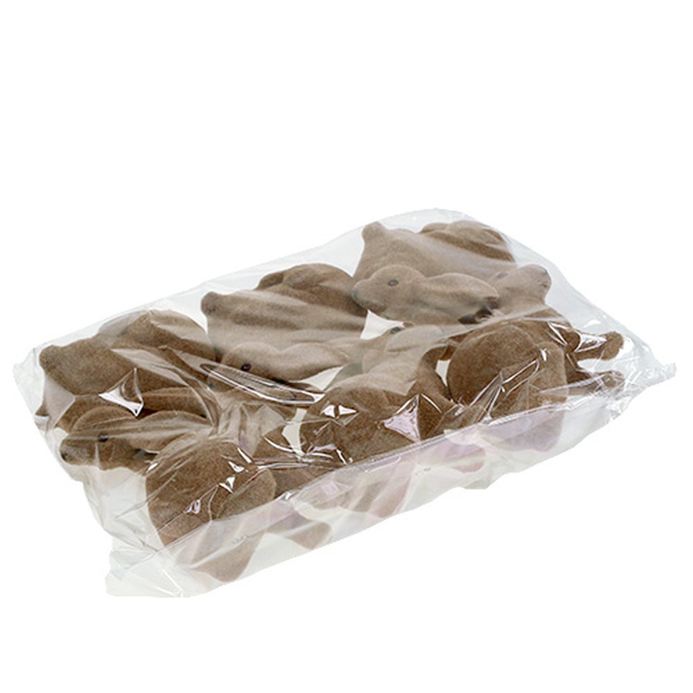 Míg az ülő, csoportosított barna nyuszi körülbelül 13,5 centiméter magas, a fekvő nyuszi körülbelül 11 centiméter magas. A 6 darabos készlet műanyag fóliába van csomagolva.