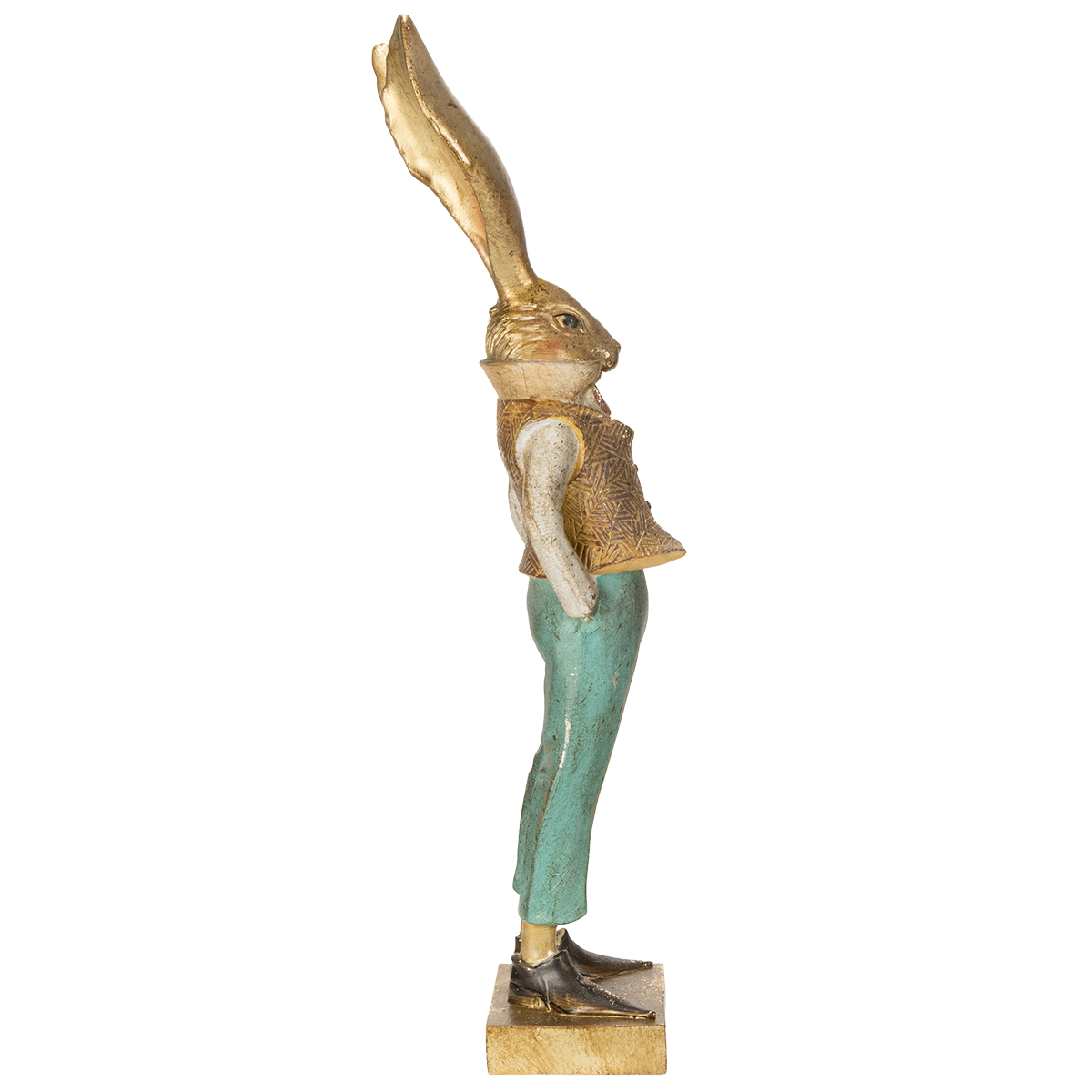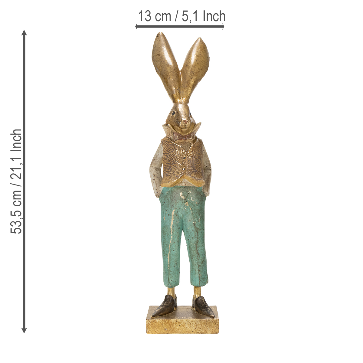 Ez a nyúlfigura harmonikusan összehangolt dizájnjával lenyűgöző. A test meleg barna tónusa és a nadrág finom zöldje kellemes kontrasztot alkot, amely egyszerre modern és időtlen hatást kelt. Különösen a poliészterkő csiszolt részletei adnak ennek a figurának élénk és élethű megjelenést. Észrevetted már, milyen szeretettel helyezték el az apró részleteket? A bájos arckifejezéstől a ruháján lévő arany díszítésekig – itt a klasszikus húsvéti dekoráció találkozik a modern eleganciával.