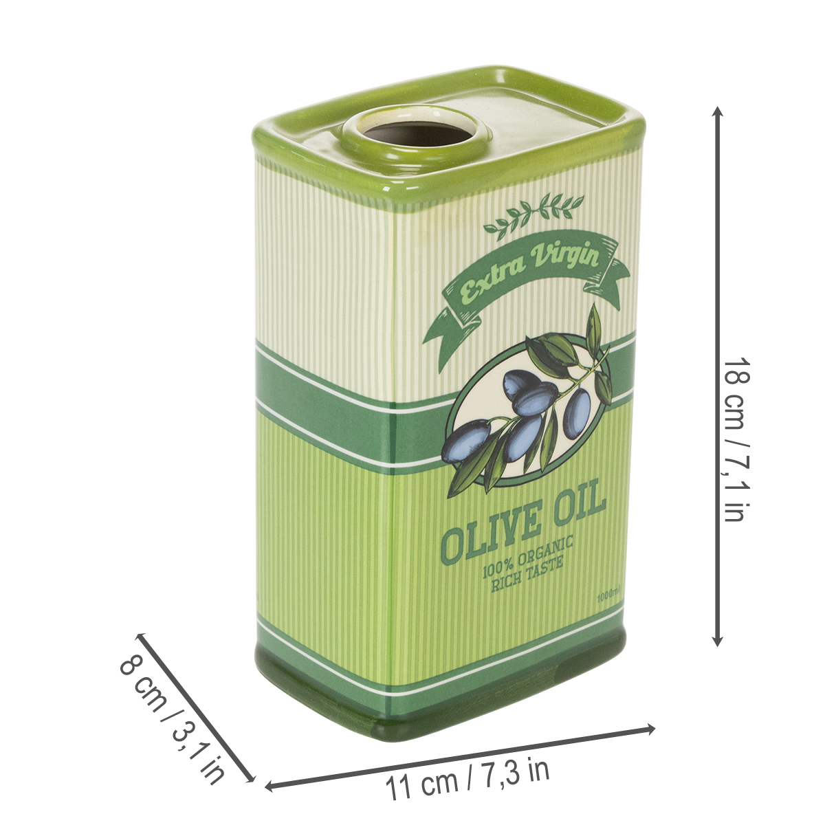 Kerámia olívaolaj vázánk azonnal szembetűnő részletekkel nyűgöz le: A mediterrán konyhák ihlette nosztalgikus retró dizájn a hagyományt és a stílust tükrözi. A kiváló minőségű zöld árnyalat természetes frissességet visz bármilyen környezetbe, legyen szó modern terítésű asztalról vagy rusztikus vidéki konyháról. A nagy kapacitás és a széles nyílás különösen egyszerűvé teszi az olívaolaj kitöltését. És amikor nem tárolóedényként használja ezt a bájos vázát, önmagában is feltűnő dekorációs elemmé válik.