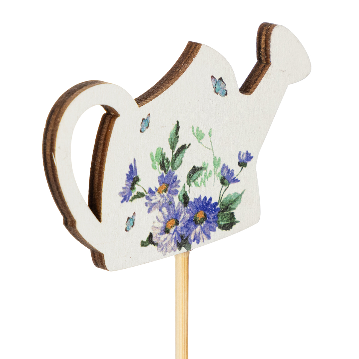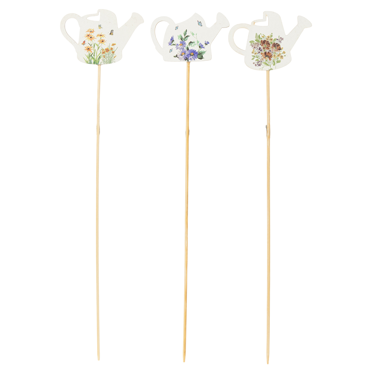 Öntözőkanna díszes karóink a dekoráció és a funkcionalitás legjavát ötvözik. 34 cm magasak és masszív fa karóval rendelkeznek, így könnyen elhelyezhetők földbe, mohába vagy virágmintás habba. A finom virágmotívumok frissítő, természetes színekben különleges hangulatot kölcsönöznek bármilyen kompozíciónak.
