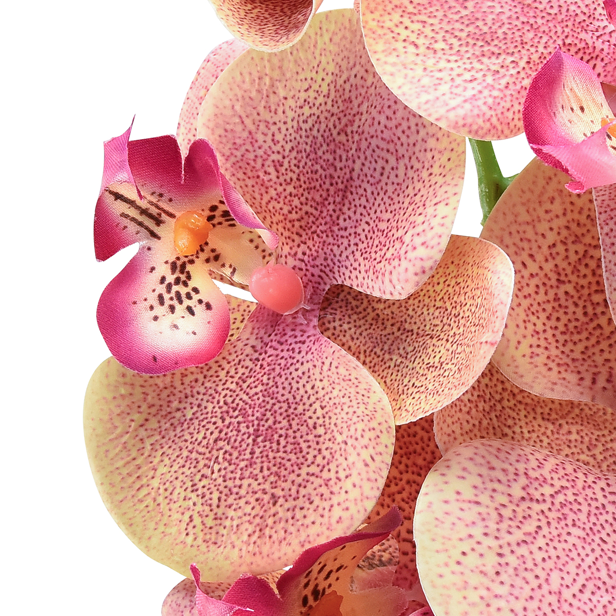 A nagyméretű műorchidea rugalmas hosszú szára különösen praktikus, ha magas vázával rendelkezik, vagy a művirágot egy nagy elrendezésbe szeretné beépíteni. Vagy egyszerűen vágja le a szárat egy kerámia edénynek vagy asztaldísznek, és tegye a nagy virágokat az állandó művirág dekoráció fénypontjává.