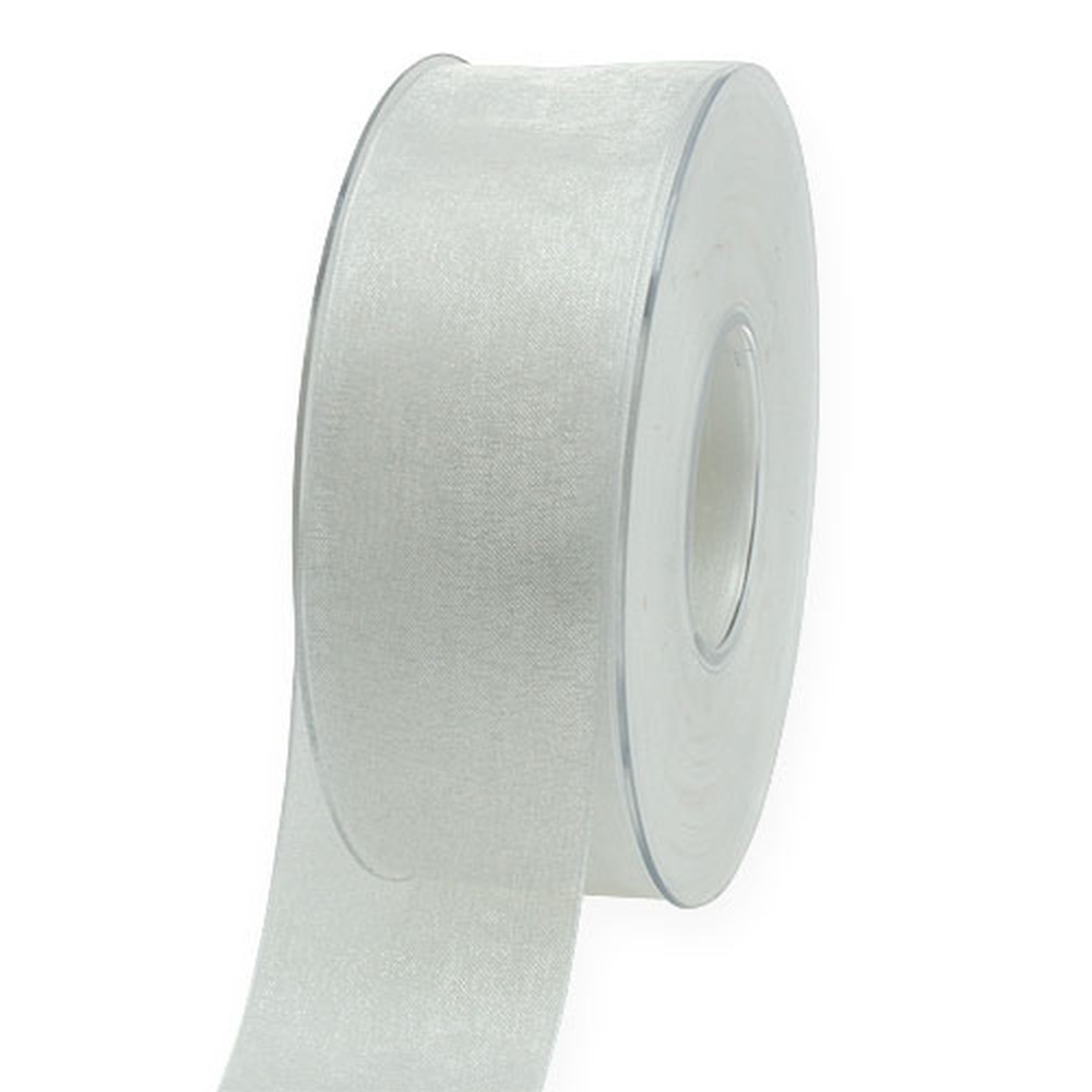 A fehér szegélyű organza szalag körülbelül 50 méter hosszú műanyag tekercsre van feltekerve, szélessége pedig körülbelül 40 milliméter.