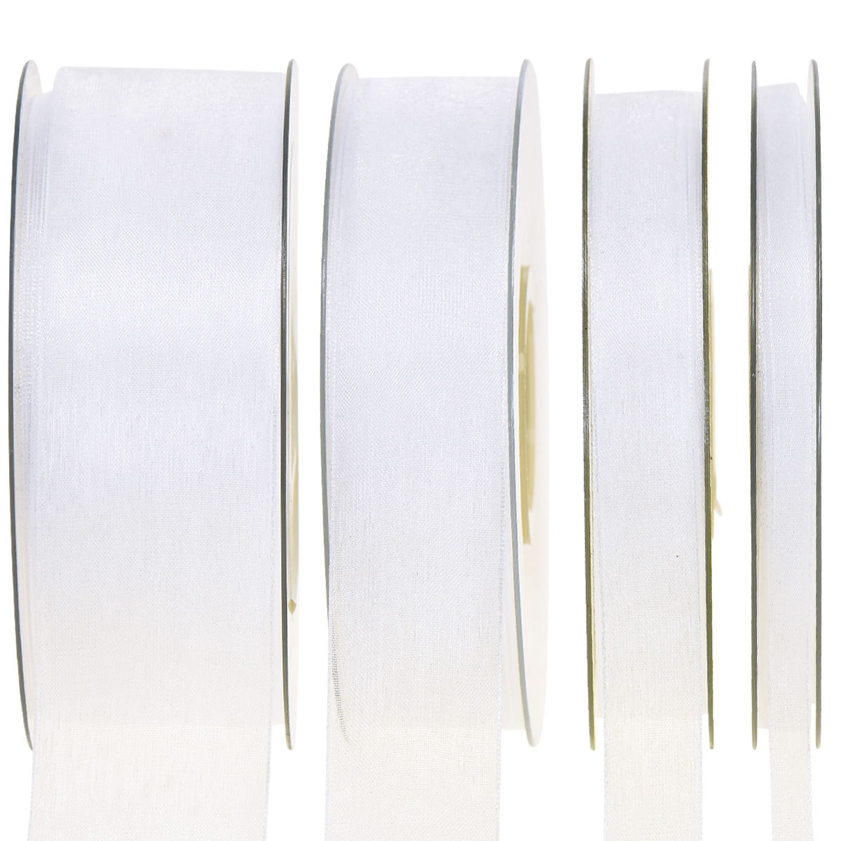 Legyen szó esküvőről, fogadásról vagy keresztelőről: Ezzel a fehér szegélyű organza szalaggal megfelelően díszítheted floristikai munkadarabjaidat! Az elegáns fehér szövetpántok különböző szélességűek, és a jobb felső sarokban található fül segítségével kiválaszthatod őket. Mindegyik szalag enyhén átlátszó, ezért nagyon légiesnek és lazának tűnik. Lehetősége van arra, hogy a szaténszalagot koszorúként használja, például temetési koszorú vagy megemlékezés kecses díszítésére.
