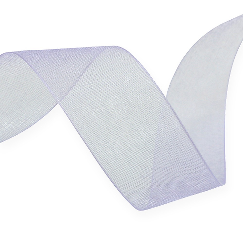 A világoslila szegélyű organza szalag egy tekercsre van feltekerve, körülbelül 50 méter hosszú. A szélessége 25 milliméter.