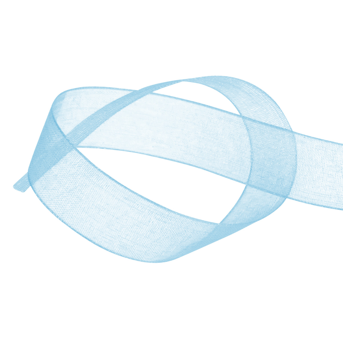 A világoskék organza szalag körülbelül 50 méter hosszú műanyag tekercsre van feltekerve. A szalag szélessége körülbelül 15 milliméter.