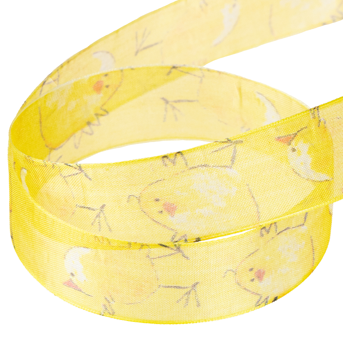 A sárga organza szalag csibékkel, amelyet ajándék- és díszszalagként használnak, körülbelül 20 méter hosszú, újrahasznosított műanyagból készült orsóra van feltekerve, szélessége pedig körülbelül 25 milliméter.