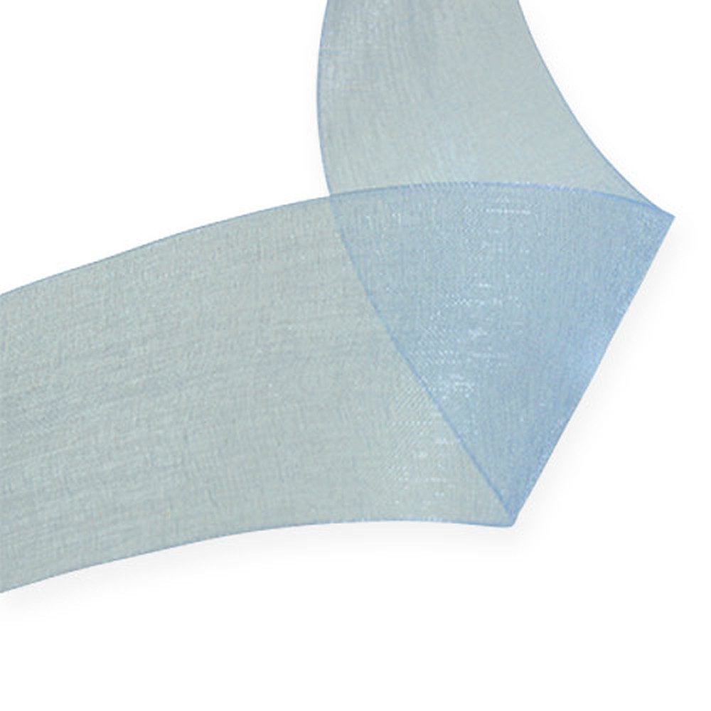 A 100% poliészterből készült, kék színű organza szalag körülbelül 50 méter hosszú, műanyag tekercsre tekercselt, és körülbelül 40 milliméter széles.