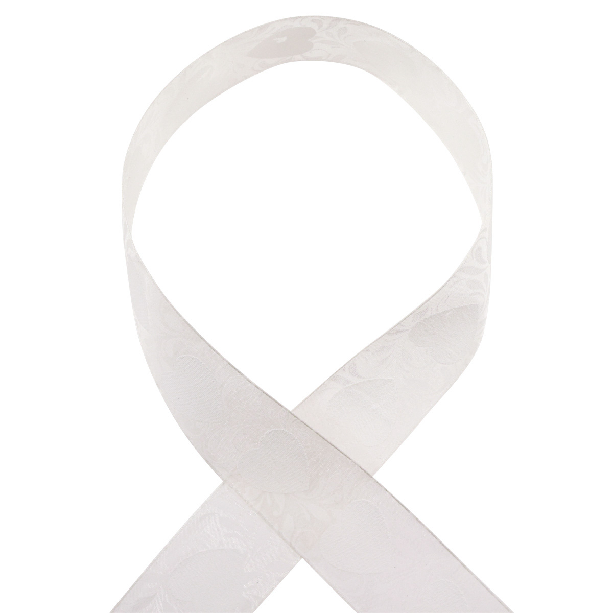 A finom szívecskéket leveles ágak veszik körül, mint a virágok, és az átlátszó organza anyagra nyomtatják, így a szalag csipkére emlékeztető kifinomult megjelenést kölcsönöz. A dekoratív szalag meleg krémes tónusa időtlen, és egyúttal bizonyos nosztalgiát is közvetít.