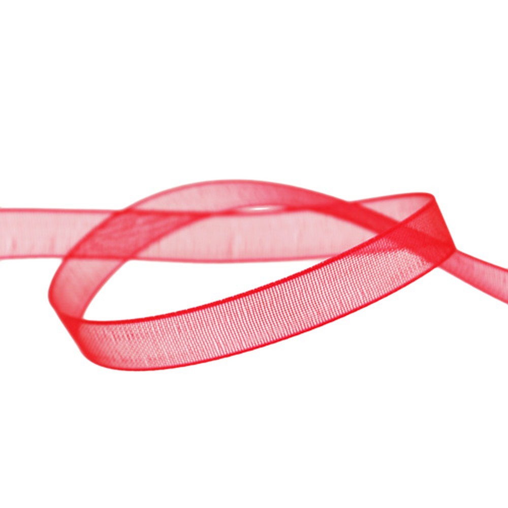 A piros organza szalag szegéllyel 100% poliamidból készült. Körülbelül 7 milliméter széles és körülbelül 50 méter hosszú műanyag orsón.