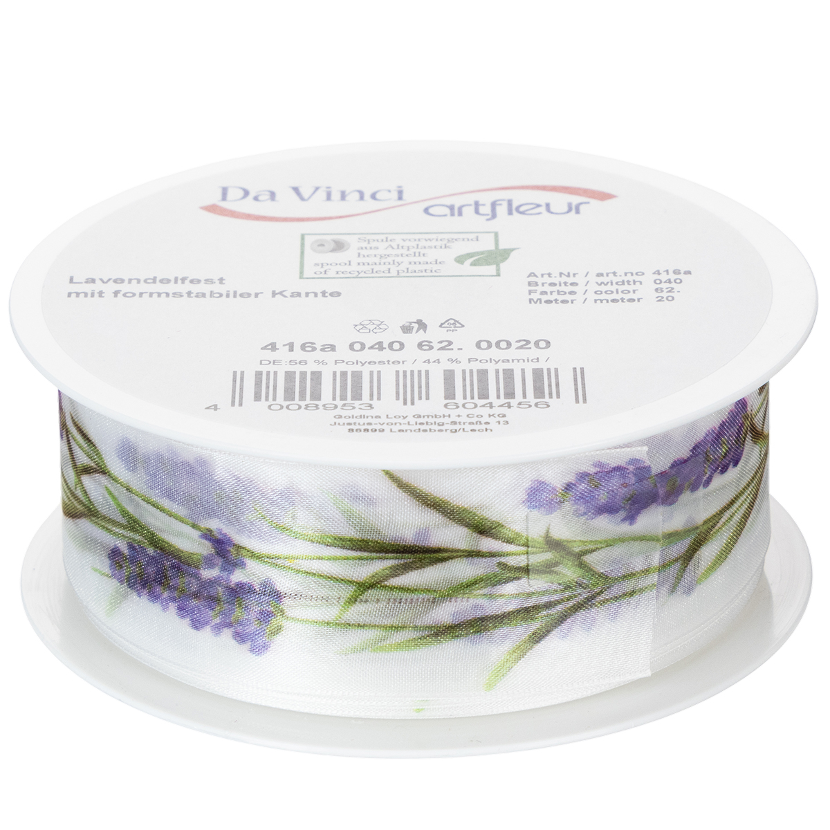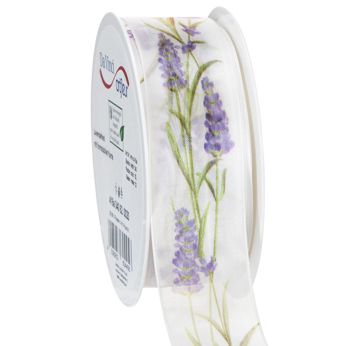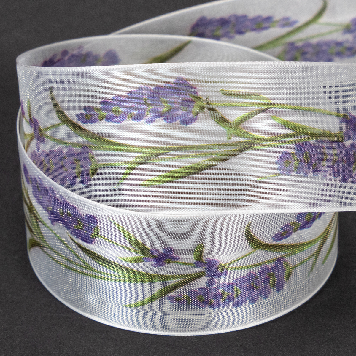 A levendula motívum frissnek és színesnek tűnik az organza szalag fehér hátterén. Átlátszó organza szövésével a sifon szalag könnyű és jellegzetes csillogású, míg az alaktartó élek festői megjelenést biztosítanak a masniknak.
