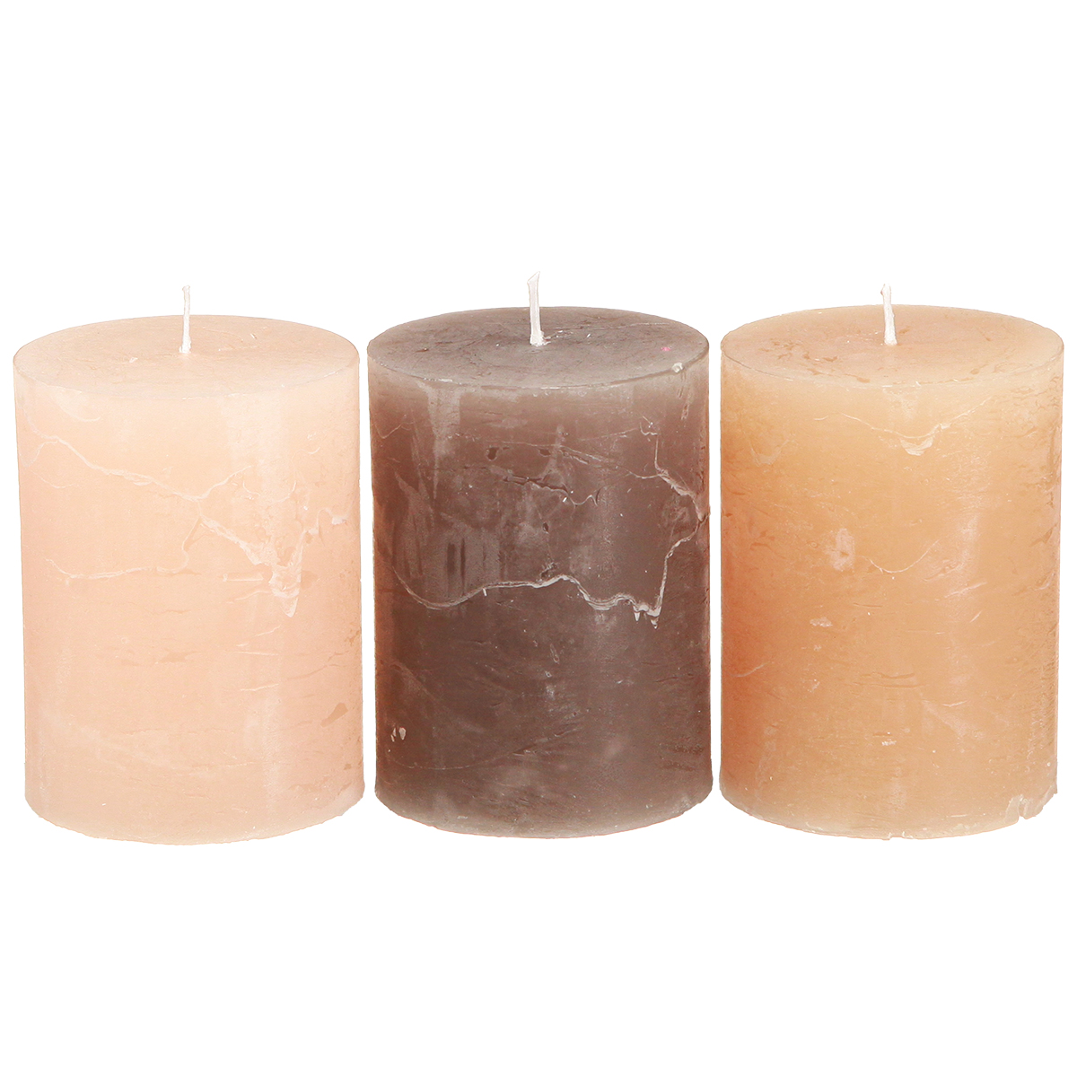 Termék neve: Oszlopgyertya szett, 3 szín: barna, barack, homok, 60x80mm, 12 darabos, rusztikus díszítés, hosszú égési idő