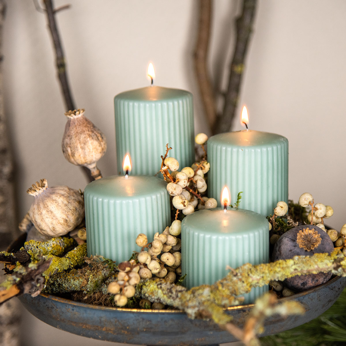 A hűvös smaragdzöld sok eredeti dekorációs ötlettel harmonizál. Akár fehér, arany, világoskék vagy fekete kiegészítőkkel kombinálja a barázdált gyertyákat, ezek az oszlopos gyertyák mindig eleganciát sugároznak.