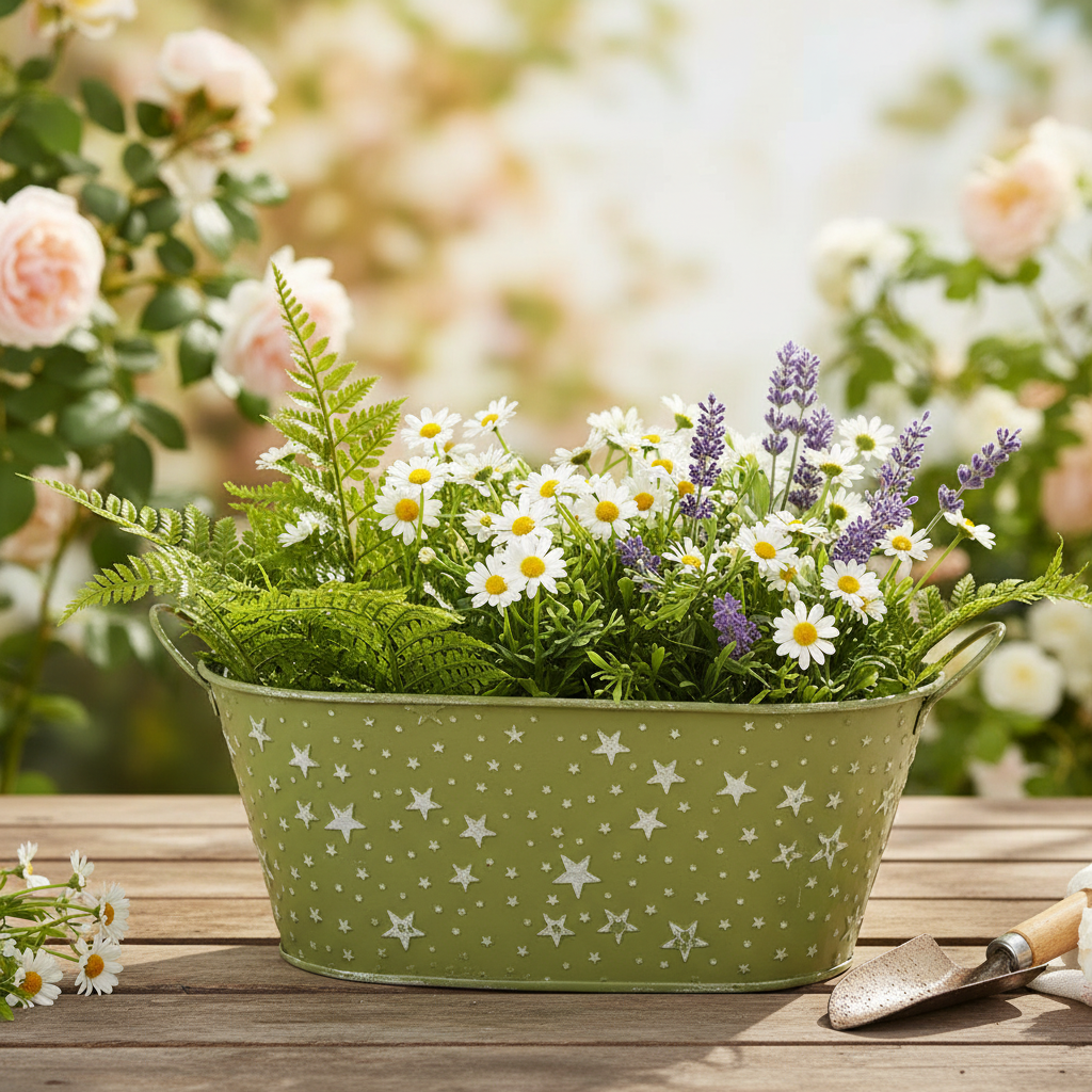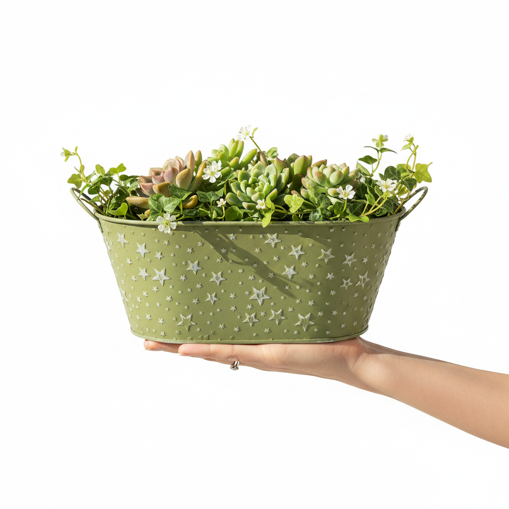 Üdvözöljük a dekorációs álmokkal teli világban! Akár karácsonyi virágcserépnek, akár ünnepi növények virágtartójának, akár elegáns virágkötészeti tálnak használjuk, ez a mohazöld tál dombornyomott csillagokkal tökéletes választás a részletekre figyelő dekorátorok és virágárusok számára. A csillagok részben kopott festése és az áttetsző fém egyedi karácsonyi dekoratív virágcserepet varázsolnak, amely nem hiányozhat egyetlen ünnepi hangulatú helyiségből sem.