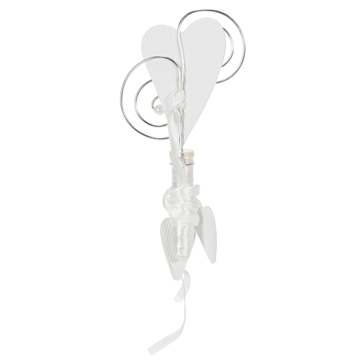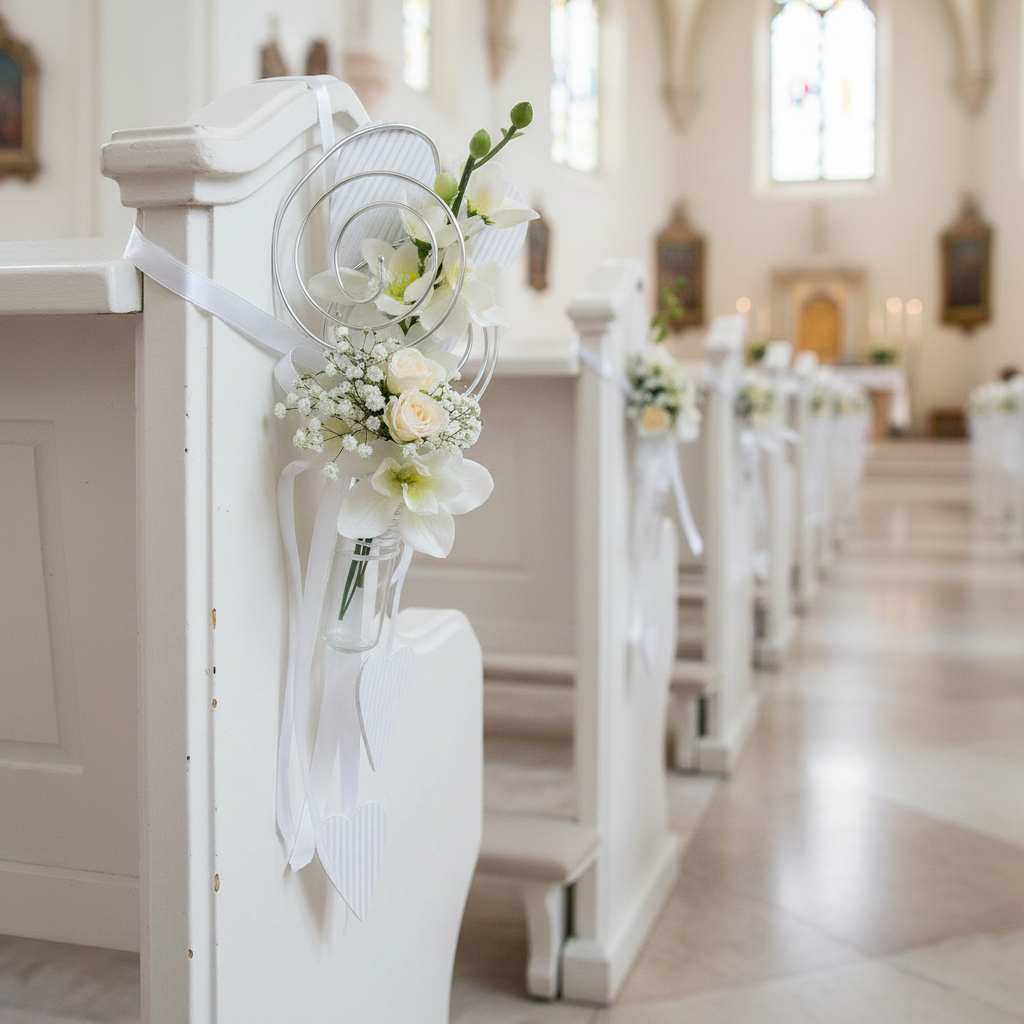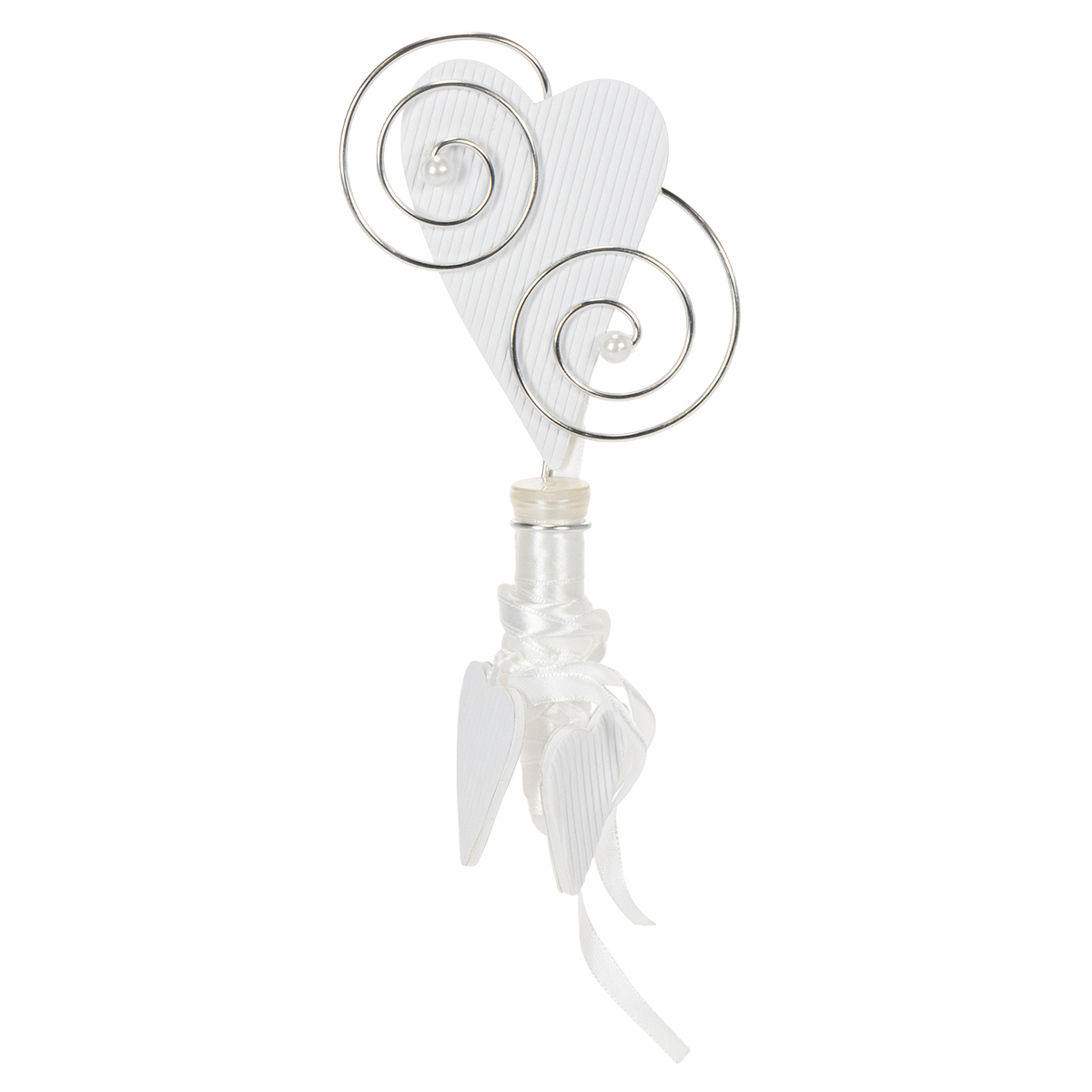 Ez a csővel és szívvel ellátott bankfogas nem hiányozhat egyetlen esküvői dekorációból sem! Akasszuk fel a szívet egy horoggal a padok külső oldalára, és hagyjuk, hogy a selyemszövetből készült fehér szalag, amelyre két szív is van hullámpapírral rögzítve, egészen szépen a padlóra essen. Mintha ez nem lenne elég, az akasztónak van egy kerek tartója, amibe kesztyűként belefér a mellékelt cső.