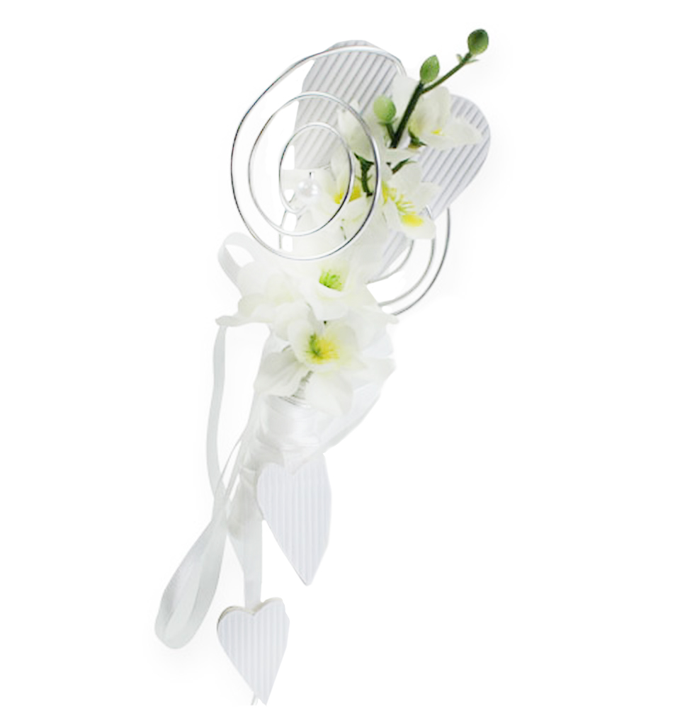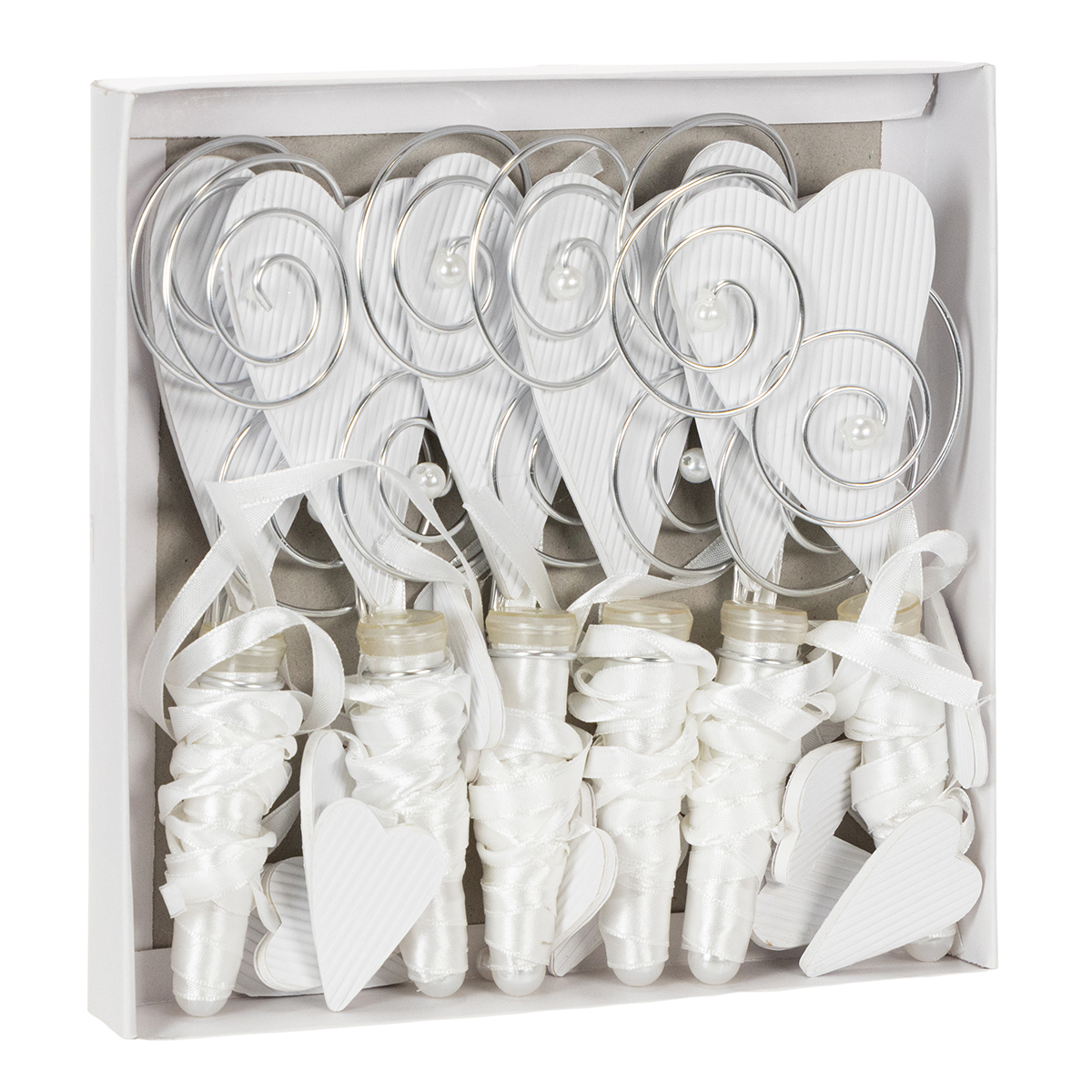A csővel és szívvel ellátott bankakasztó összesen 6 db-os készletben található. A hosszú selyemszalaggal az esküvői szívakasztó teljes hossza körülbelül 92 centiméter, míg maga a fémszív körülbelül 18 centiméter hosszú és körülbelül 9 centiméter széles. A fehér hullámkartonnal díszített nagy szív mellett két csillogó műanyag gyöngy is található a gyönyörű esküvői dekoráción.