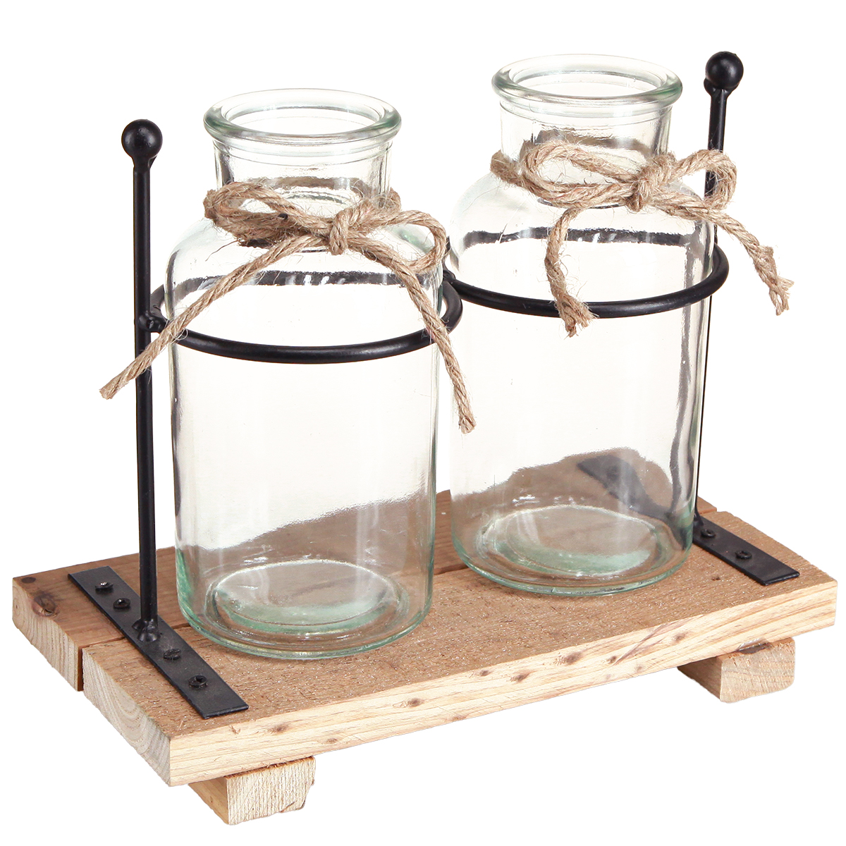 Fedezze fel az üveg, a fa és a fém tökéletes szimbiózisát kulacsvázáinkkal – ideális kiegészítője asztaldísznek. Az anyagok kombinációja egyedi vintage varázst hoz létre, amely tengeri hangulatot varázsol minden helyiségbe. Ez a két üvegpalack fa alapon áll, és egy fekete fém tartó tartja őket. Az időtlen fekete modern hatást kölcsönöz, míg a palack nyakán lévő juta szalagok rusztikus hatást adnak minden elrendezéshez. Körülbelül 23 cm × 12 cm × 19,5 cm méretű összeállítás tökéletes a friss és szárított virágok elegáns megjelenítéséhez.