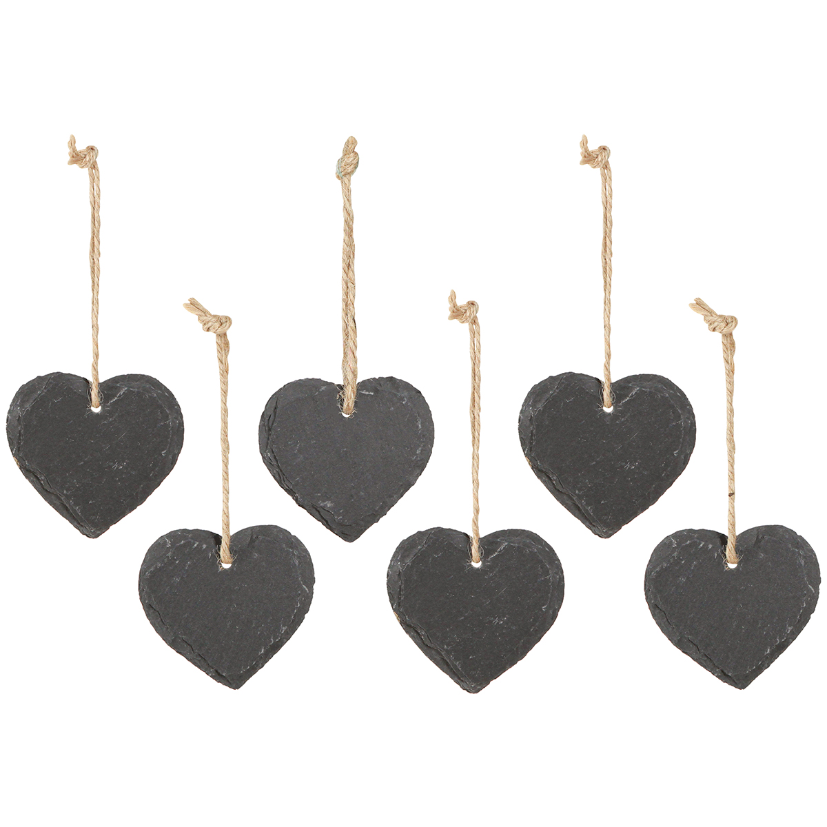 A felakasztható palát szív alakúra kapod 6 db-os kiszerelésben. A palalemez juta zsinórral rendelkezik. Méretük körülbelül 7,5 cm x 7 cm.