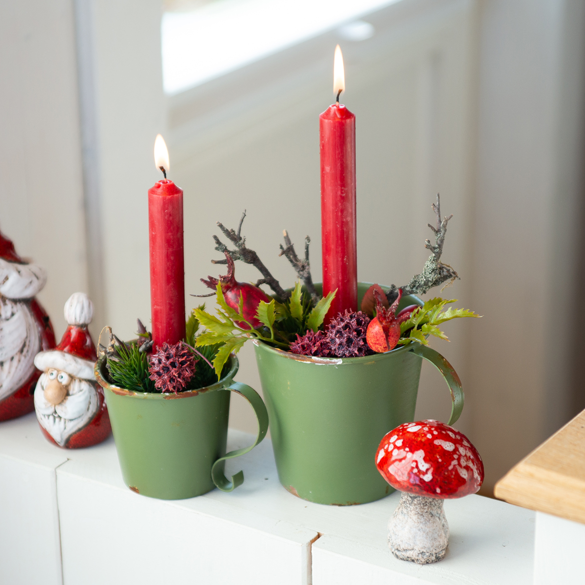 Akár az étkezőasztalon az ünnepi asztaldísz részeként, akár az ablakpárkányon, mint stílusos karácsonyi prezentáció – ezek a gyertyatartók az ősiséget közvetítik és rendkívül dekoratívak. A nosztalgikus dizájn és a zöld friss árnyalatának kombinációja igazi szemet gyönyörködtetővé varázsolja otthonában.