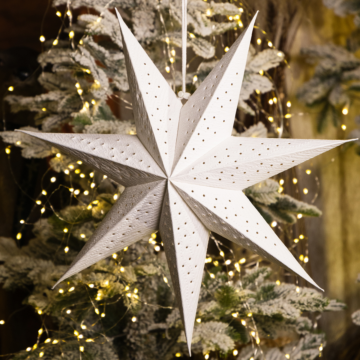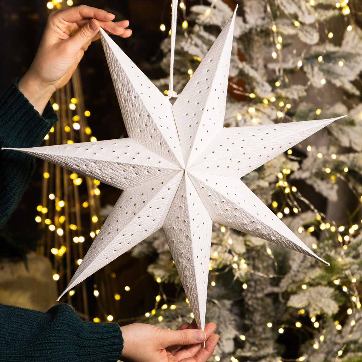Ezek a papírcsillagok nemcsak vonzó dizájnjukkal, hanem átgondolt részleteikkel is lenyűgöznek. Masszív papírból készültek, így elég tartósak ahhoz, hogy évről évre díszítsék karácsonyfadíszeidet. 45 cm-es méretükkel lenyűgözően mutatnak egy ablakban, de elegáns világításként az étkezőasztal felett vagy egyedi karácsonyfadíszként is használhatók. Azok, akik az egyszerűbb, természetesebb megjelenést kedvelik, imádni fogják a fehér csillagokat. Gyönyörűen harmonizálnak fenyőágakkal, hófödte műnövényekkel, visszafogott karácsonyfadíszekkel vagy más papírdíszekkel.