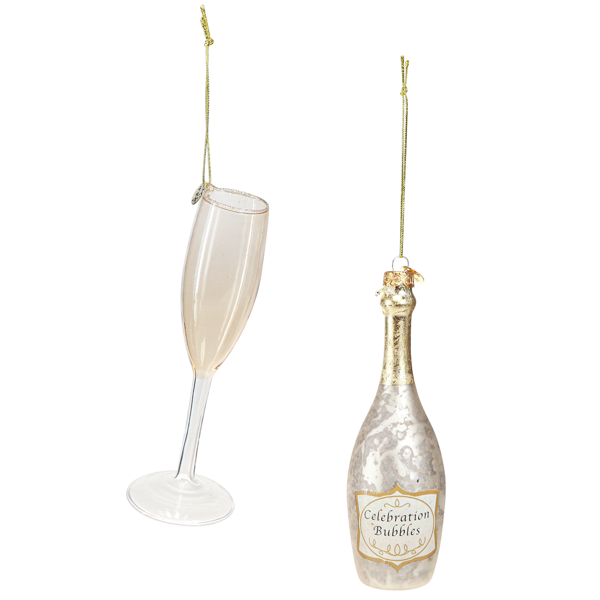 Pezsgős üveg és pohár, fadíszek, évforduló, akasztható üvegdíszek, szilveszteri H14,5cm valódi pohár 2db