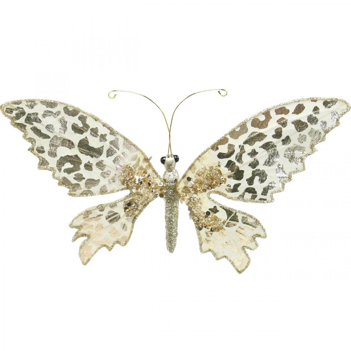 A pillangó stabil teste polirezinből készült, szárnyai krémszínű papírból készültek, arany leopárdmintával. A gyönyörű rovar testét és a szárnyak szélét arany csillogás borítja, a szárnyakat szintén üveggyöngyök és strasszok díszítik a tövénél.