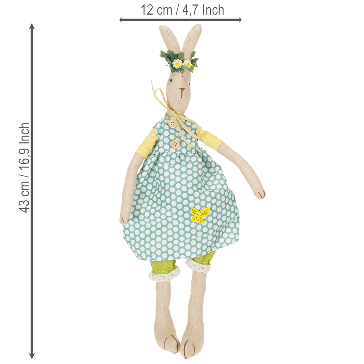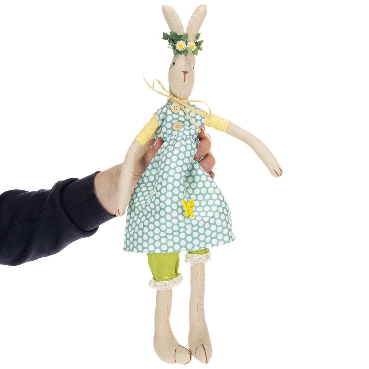Az aranyos nyuszi lány egyszerű természetes anyagból készült, és tavaszias kék ruhát visel, nagy fehér pöttyökkel. Alatta sárga-fehér ujjak és csipkeszegélyű csinos zöld háremnadrág teszik teljessé a ruhás nyuszi öltözékét. A gyönyörű nyuszi olyan csodás részletekkel is elvarázsol, mint a fa gombok és a köntösön a pillangós díszítés, valamint a nyakában egy egyszerű papírszalagból készült masni. A kitömött nyuszi filigrán virágkoszorút visel a fején, ami kiegészíti megjelenését.