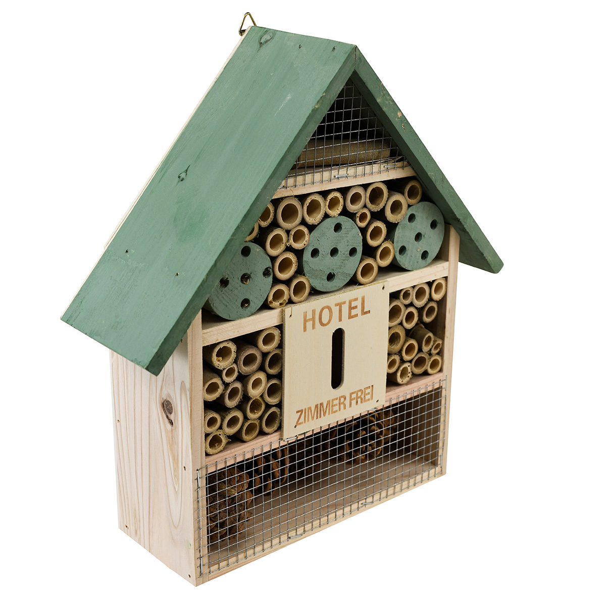 Megkapja a világos fából készült, zöld színű nyeregtetős rovarszállót.