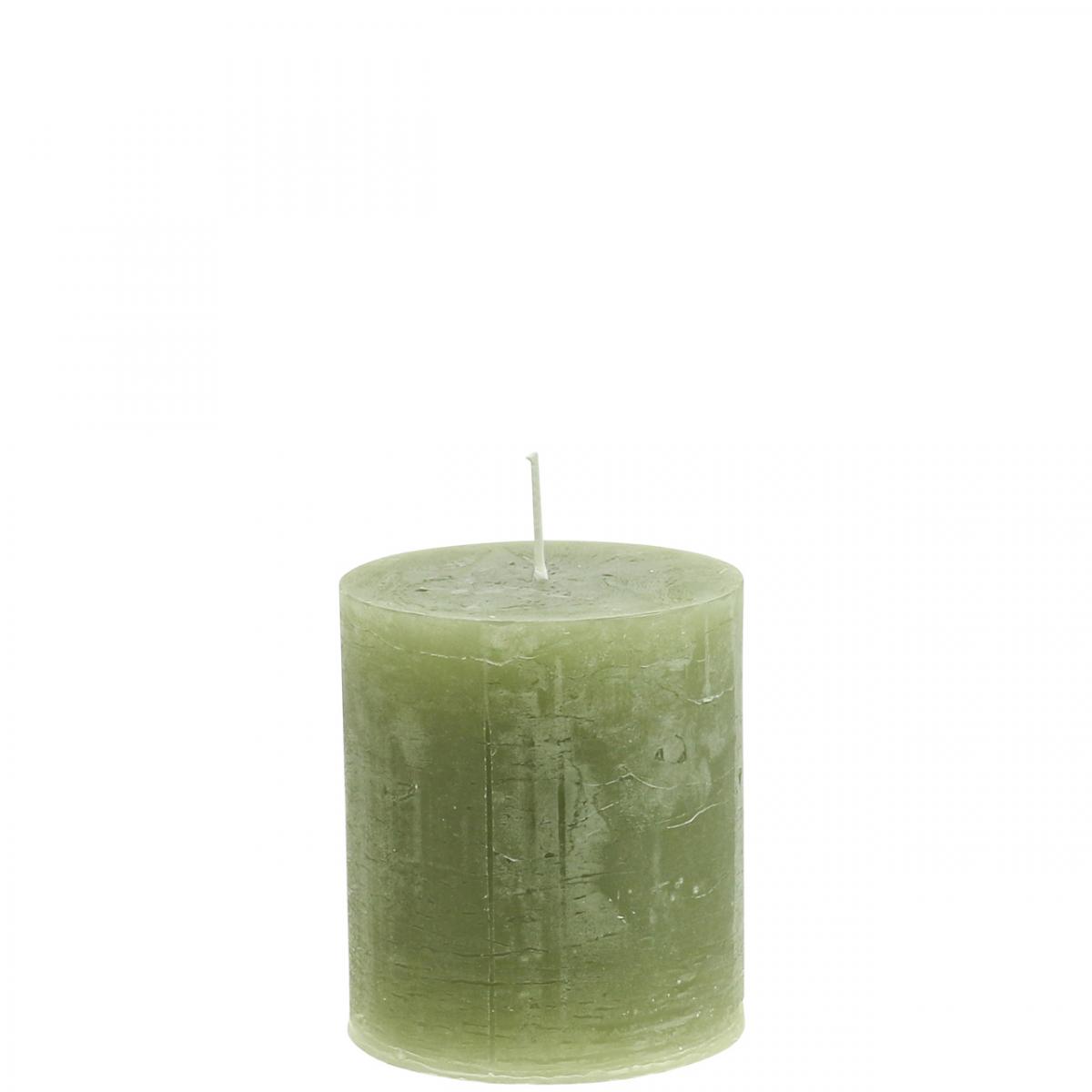 Rusztikus, egyszínű, olívazöld oszlopgyertyák, 70x80mm, 4 db-os készlet, díszgyertyák, viaszgyertyák