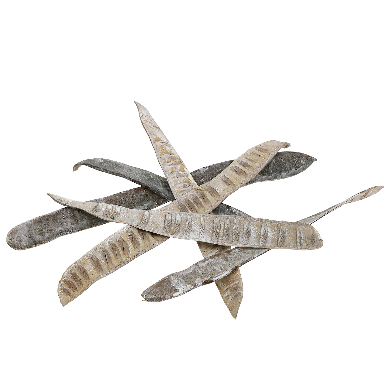 A fehér scaletta hüvely teljes egészében szárított és festett fából készült. 25 darabos készletben szállítjuk. A példányok hossza 28 centiméter és 40 centiméter körül mozog. Mindegyik hüvely körülbelül 4 centiméter széles.