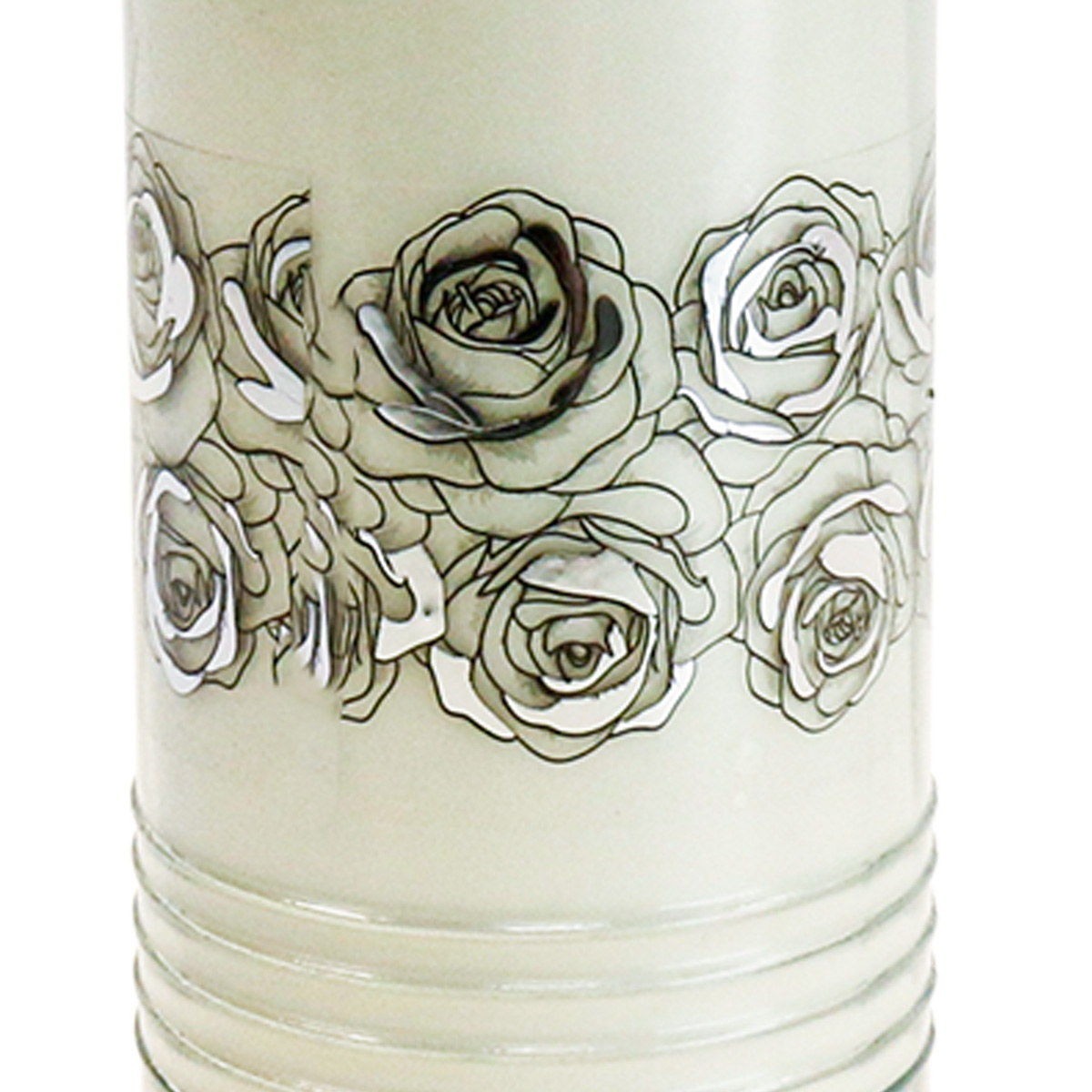 A fehér színű sírgyertyákat kecsesen díszíti ezüst rózsaszegély. Fedő védi a sírgyertyát a nedvességtől és az esőtől.