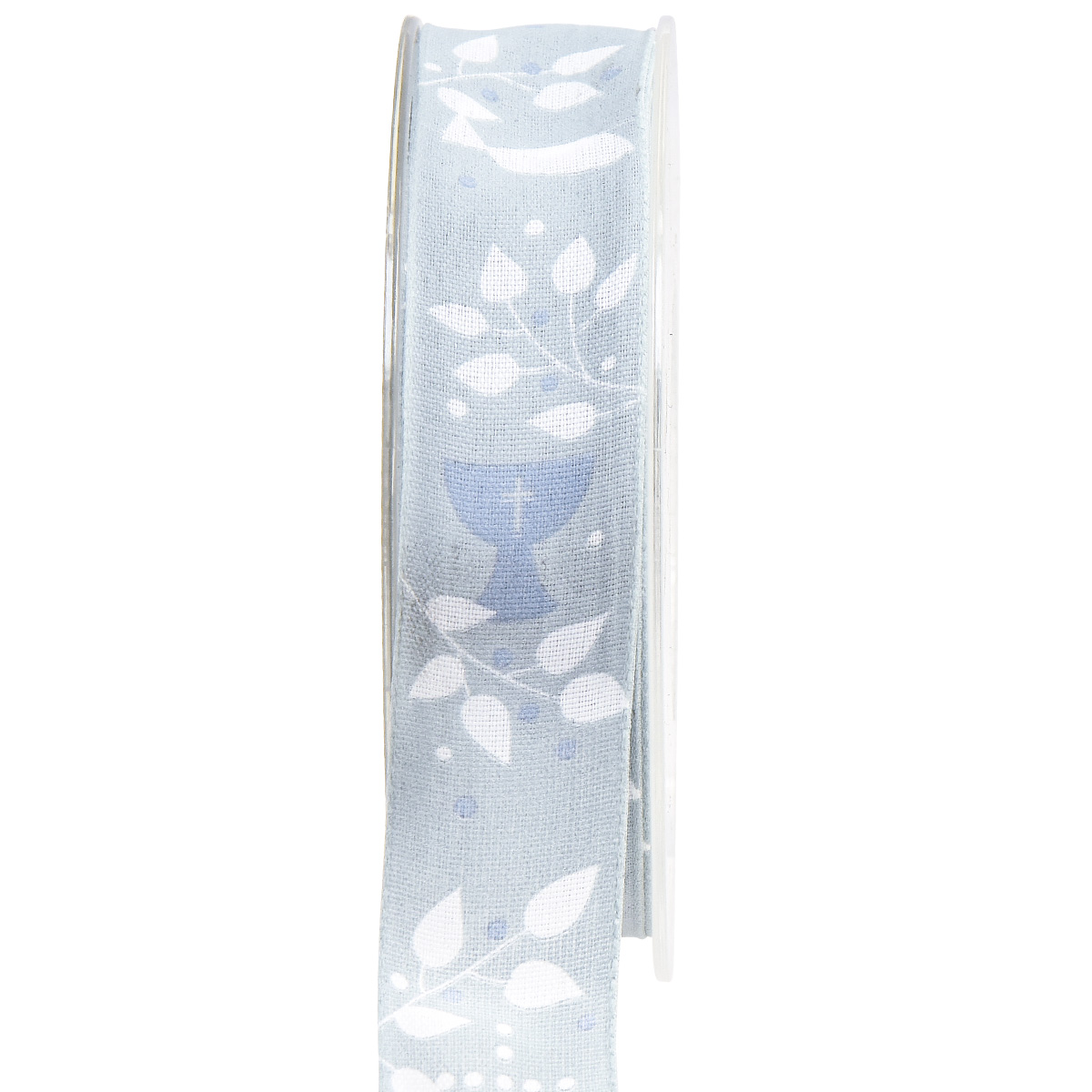 A világoskék szövetszalag fehér és sötétkék keresztény szimbólumokkal van nyomva, amelyek a vallási alkalomra utalnak, és csodálatosan időtlen designnal rendelkeznek. Mivel a motívumokat levélindák övezik, a szalag könnyedén beilleszthető a virágdíszekbe a közösséghez. Egy szegély biztosítja a dekoratív szalag stabilitását.