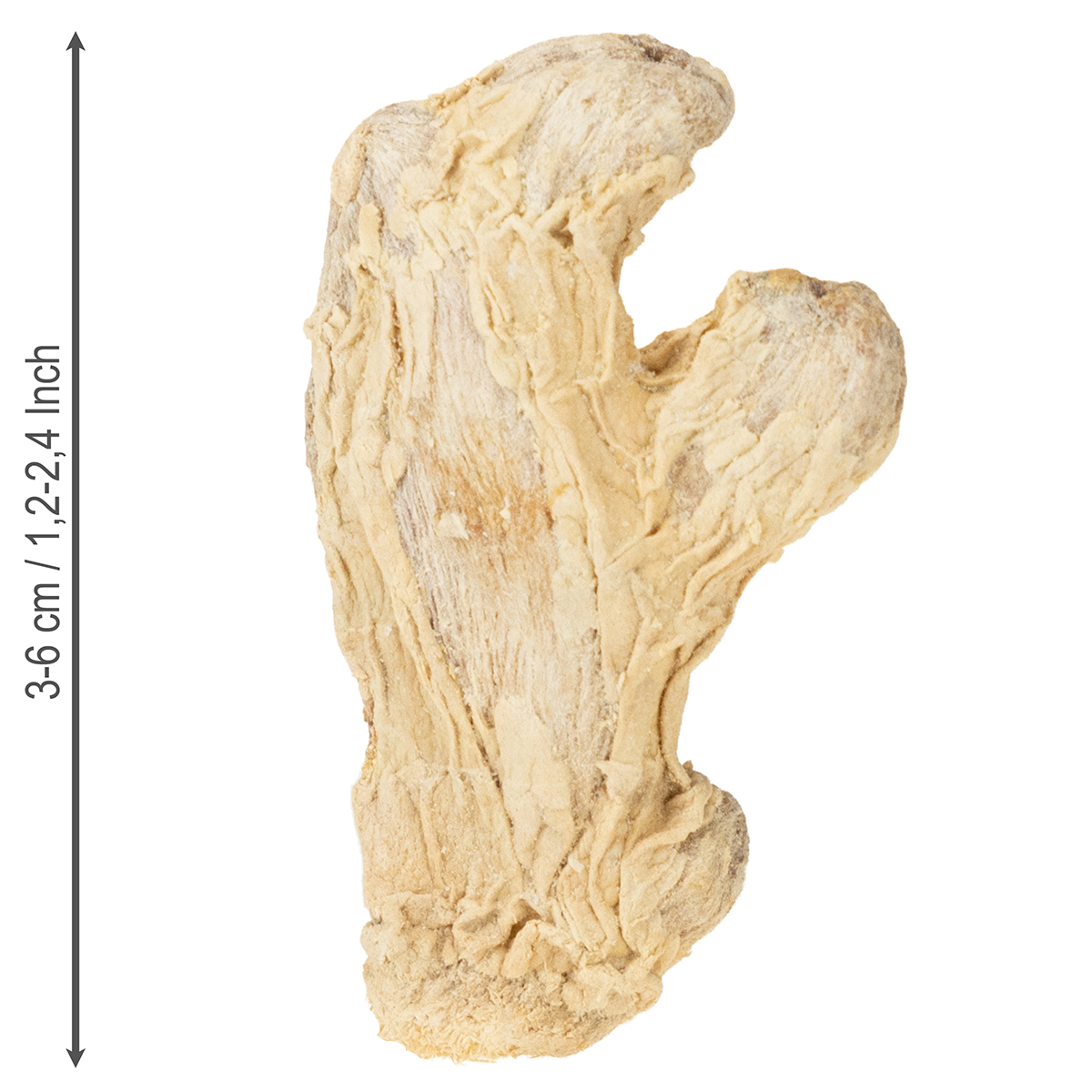 A szárított gyömbért 500 grammos zacskóban szállítjuk. Az egyes darabok mérete változó, 3 és 6 centiméter között lehet.