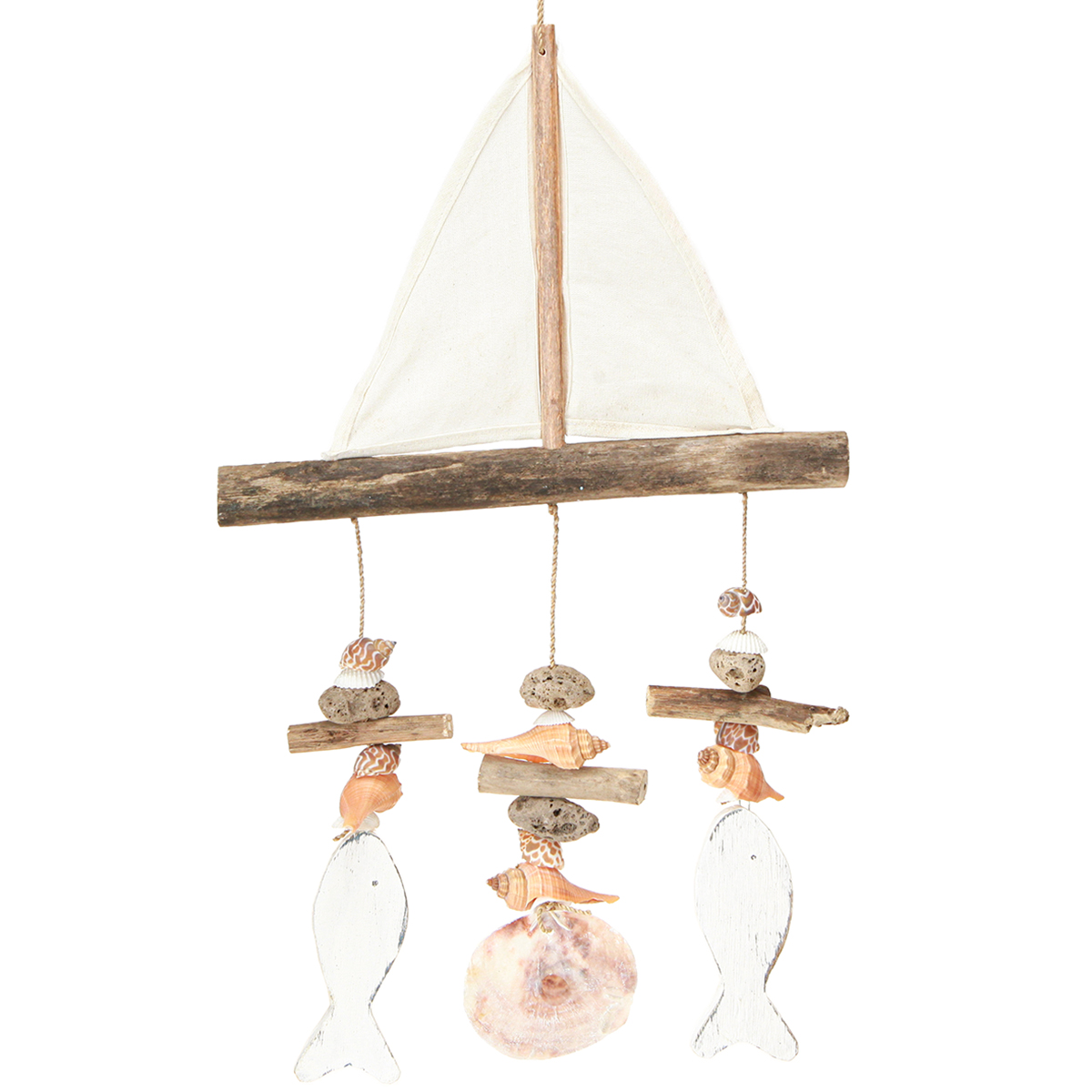 Varázsoljon otthonába varázslatos tengerparti hangulatot vitorlás hajódíszítéssel és fehér és természetes fából készült halakkal díszített szélcsengőnkkel. Ez a lenyűgöző tengeri függődekoráció tökéletes mindazok számára, akik szeretnék megérezni a tenger varázsát lakóterükben. A vitorlás lenyűgözi finom kidolgozásával és természetes anyagok, például fa és kagylók használatával, amelyek pihentető és harmonikus környezetet teremtenek. A tengeri témájú függő dekoráció ideális a nappaliban vagy az erkélyen, hogy felhívja magára a figyelmet. A fa természetes színei és a fehérített textilvitorla vonzó nyugalmat kölcsönöz dekorációjának. Más tengeri kiegészítőkkel, például hálókkal és horgonyokkal tökéletesen kombinálva a vitorlás hajó frissítő szellőt biztosít a ház minden sarkában.