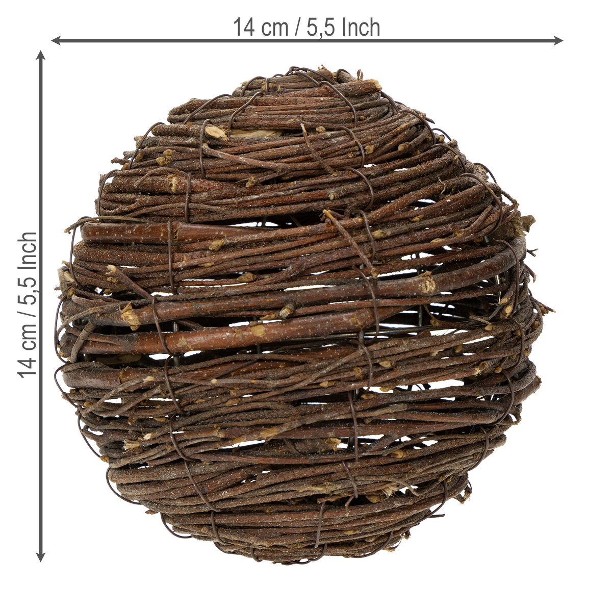 A fonott díszlabda természetes szőlőből kézzel készült. A meleg barna szín és az ágak rusztikus textúrája meghitt hangulatot teremt. A robusztus fémrácsnak köszönhetően a labda még nagyobb terhelést is elbír, és ideális felületet kínál egyéb díszítőelemekhez, például szárított virágokhoz vagy díszszalagokhoz. Kompakt méretük miatt ideális dekorációs tárgy, amely nagy és kis helyiségekben egyaránt használható.